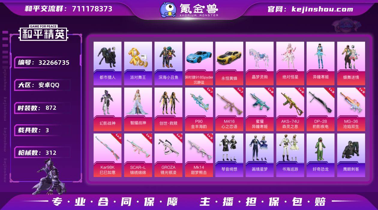 【特价出售】安卓Q-4稀有3载具6粉装15特效枪17热门232套装312枪皮 100666热力值 22印记 历史无敌战神 【4稀有】 AWM-黄金龙骨 都市猎人 派对舞王 派对舞王(金靴子) 【3载具】 保时捷918Spyder(沉静蓝) 永恒黄蜂 晶梦灵驹 【6粉装】 蝶舞迷情 异瞳寒姬 创世救赎 幻影战神 绝对恒星 智耀战神 【15特效枪】 SCAR-L-锦绣绵绵 (5级) M416-心之恋语 (7级) P90-金丰海韵 (7级) AKS-74U-森灵之息 (5级) Kar98K-巳巳如意 (5级) MG-36-沧焰双生 (5级) DP-28-豹影疾电 (5级) 蜜獾-异瞳寒姬 (6级) Mk14-甜梦熊击 (5级) GROZA-镜光银凌 (5级) 汤姆逊-热量炸弹 (5级) M249-绝对恒星 (6级) AKS-74U-森灵之息 (5级) Mk14-福马献瑞 (5级) UMP45-萌骑冒险 (3级) 【17热门】 小丑鱼 龟仙人 暗夜之虎 晶辉守护 鹰眼刺客 好奇恐龙 软萌银虎 暗夜之虎 深海小丑鱼 TT战队服 团圆交子 瑞龙福将 粉红小猪 漫步者 破蛋小黄鸡 极速红龙 M762-瑞龙福将 【2头盔】 幻影战神头盔 金羽特工头盔