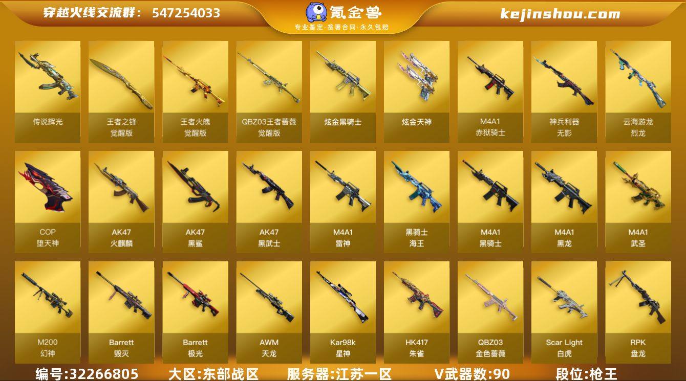 【ky4592】江苏一区-93V-3王者-2炫金 【传说武器】:传说辉光 【热门武器】:传说辉光,QBZ03-金色蔷薇,Scar Light-白虎,HK417-朱雀,M200-幻神*2,死亡之眼*3,Kar98K-星神,M4A1-黑骑士,汤姆逊-烈龙*7,RPK-盘龙*3,加特林-炼狱*4,斯泰尔-蝴蝶,降世魔童,USP-雷暴,COP-堕天神,沙鹰-修罗*8,黄金猫猫手套-白鲨,金刚伞 【王者炫金武器】:炫金骑士,炫金天神 【音效卡】:M200-幻神音效卡,AK47-火麒麟音效卡,M4A1-雷神音效卡,M4A1-黑龙音效卡,M4A1-黑骑士音效卡,Barrett-毁灭音效卡,Barrett-极光音效卡,Scar Light-白虎音效卡,70KG语音包 【皮肤】:幻神-AG-CFPLS17冠军,幻神-宠儿-2021MVP,幻神-CFS2022,M200-幻神-荣耀世冠白鲨,白虎-电玩粉兔皮肤,QBZ03-AG-CFPLS19冠军,星神-枪娘默 皮肤,雷神-暗月,雷神-耀金皮肤,雷神-荣耀世冠AG,雷神-机甲刑天皮肤,雷神-宇航兔皮肤,火麒麟-华夏之心,火麒麟-轻羽皮肤,火麒麟-战神关羽,火麒麟-百城,火麒麟-巅峰荣耀,毁灭耀金皮肤,毁灭-星空,毁灭-黑大圣皮肤,毁灭-神秘黑洞皮肤,M4A1-千变-孔明皮肤,黑龙-能量核心,黑龙-暗月,战神-粉色甜心皮肤,AK47-B-常胜将军-刘备*2,AWM-天龙-传奇70KG,极光-能量核心,炼狱-玩具枪皮肤,修罗-星空,屠龙-荣耀之锋,麒麟刺-萌杀皮肤 【角色】:零,葵,鹰,王者-瞳-闭月羞花,乔伊教练,云海玲珑,炽天使,空,初恋灵狐,芳心审判者,风暴女,嘉年华灵狐,零-水下丽影,灵狐者-X,灵狐者-七夕宝贝,灵狐者-职业经理,龙儿-小淘气,曼陀罗-礼服,萌儿,潘多拉-X,潘多拉-甜心教官,青霞仙子,铁骑荣耀,兔囡囡,雪莉杨-摸金校尉,夜玫瑰-幻能朋克,樱-青春偶像,樱-战斗天使,影武者-X,职业选手 【人偶武器】:M4A1-雷神-精英刀锋,斯泰尔-蝴蝶,Barrett-战龙-灵狐者,M37-葵,COP-旗袍,夺魂,迷你...