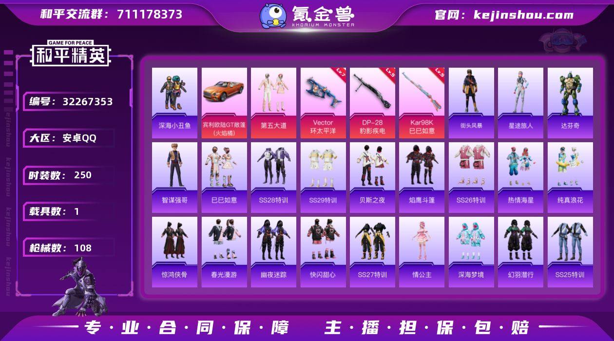 【特价出售】钱包不能注销安卓Q-1载具1粉装4特效枪3热门65套装108枪皮 31850热力值 历史不朽星钻Ⅱ 【1载具】 宾利欧陆GT火焰橘 【1粉装】 第五大道 【4特效枪】 Kar98K-巳巳如意 (5级) DP-28-豹影疾电 (5级) Mk14-福马献瑞 (5级) Vector-环太平洋 (7级) 【3热门】 龟仙人 深海小丑鱼 破蛋小黄鸡