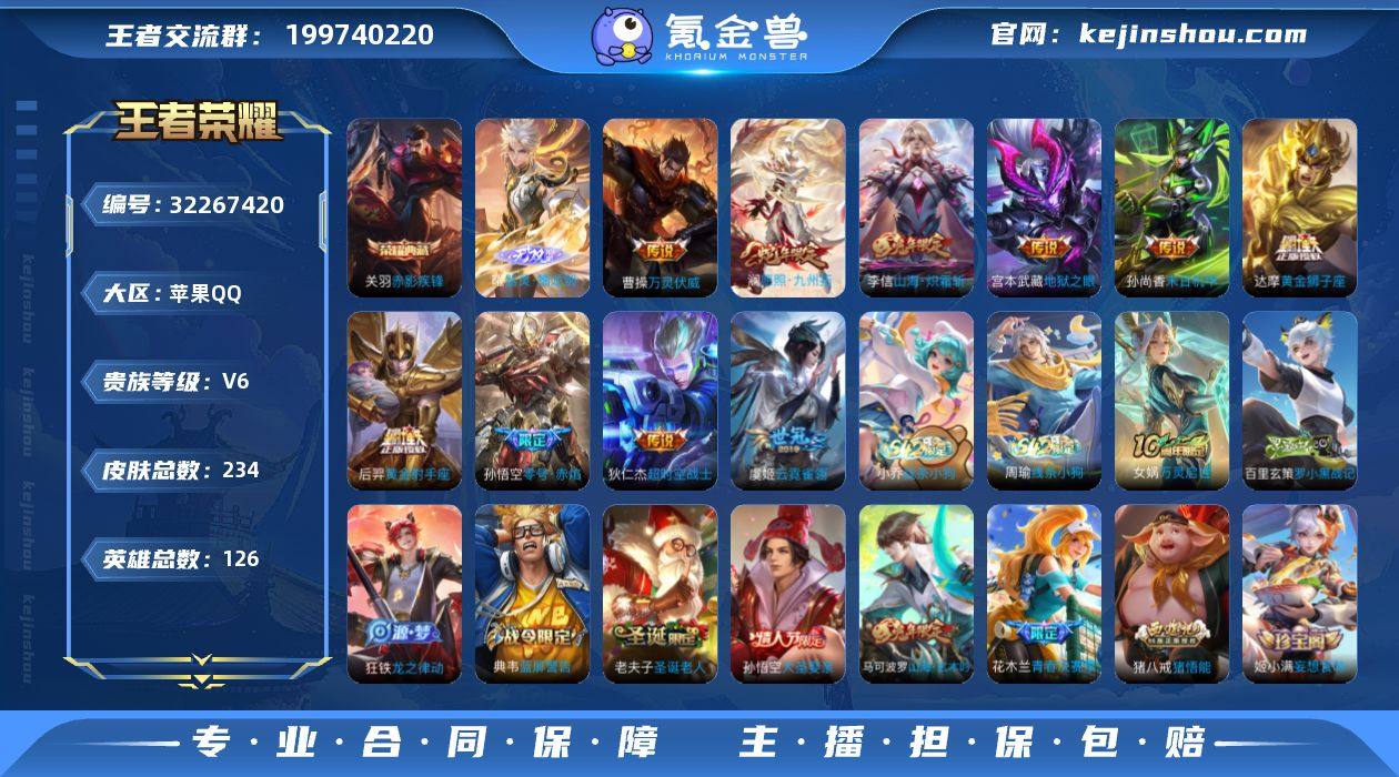 苹果Q-V6-最强王者段位-126英雄-234皮肤-1典藏皮肤-1无双-10传说-60史诗 【英雄全皮】:孙权全皮 【荣耀典藏】:关羽赤影疾锋 【无双皮肤】:曜器灵螭龙剑 【传说皮肤】:曹操万灵伏威,澜愿照九州拓,李信山海炽霜斩,孙悟空零号赤焰,虞姬云霓雀翎,达摩黄金狮子座,后羿黄金射手座,孙尚香末日机甲,宫本武藏地狱之眼,狄仁杰超时空战士 【限定皮肤】:白起狰,狄仁杰阴阳师,虞姬凯尔特女王,赵云皇家上将,嬴政优雅恋人,庄周高山流水,高渐离死亡摇滚,扁鹊炼金王,吕布御风骁将,夏侯惇朔风刀,甄姬游园惊梦,曹操烛龙,典韦穷奇,典韦蓝屏警告,马可波罗山海玄木吟,狄仁杰魔术师,狄仁杰万华元夜,达摩沙漠行僧,项羽海滩派对,老夫子圣诞老人,老夫子醍醐杖,程咬金演武夺筹,露娜一生所爱,韩信逐梦之影,兰陵王金庭之子,花木兰青春决赛季,孙悟空大圣娶亲,孙悟空零号赤焰,牛魔御旌,李元芳云中旅人,虞姬霸王别姬,钟馗驱傩正仪,杨玉环遇见飞天,女娲朔望之晖,雅典娜黎明之约,太乙真人饕餮,太乙真人华丽摇滚,鬼谷子原初探秘者,鬼谷子五谷丰年,苏烈千军破阵,百里玄策原初追逐者,弈星混沌棋,梦奇顽趣,沈梦溪大漠名商,明世隐疑决卦,裴擒虎李小龙,裴擒虎擒涛扼浪,狂铁御狮,米莱狄御霄,李信山海炽霜斩,盾山御銮,猪八戒猪悟能,上官婉儿梁祝,鲁班大师探海日志,桑启海盐诗旅,艾琳女武神,张良古海寻踪,鬼谷子天穹祈灯,伽罗琥珀纪元,姬小满妄想食味,沈梦溪龙舞盛年 【年限皮肤】:吕布御风骁将,李信山海炽霜斩,马可波罗山海玄木吟,澜愿照九州拓 【赛季限定】:扁鹊炼金王,虞姬凯尔特女王,白起狰,太乙真人饕餮,曹操烛龙,典韦穷奇,狂铁御狮,米莱狄御霄,牛魔御旌,盾山御銮,夏侯惇朔风刀,弈星混沌棋,明世隐疑决卦,老夫子醍醐杖,鬼谷子原初探秘者,狄仁杰万华元夜,...