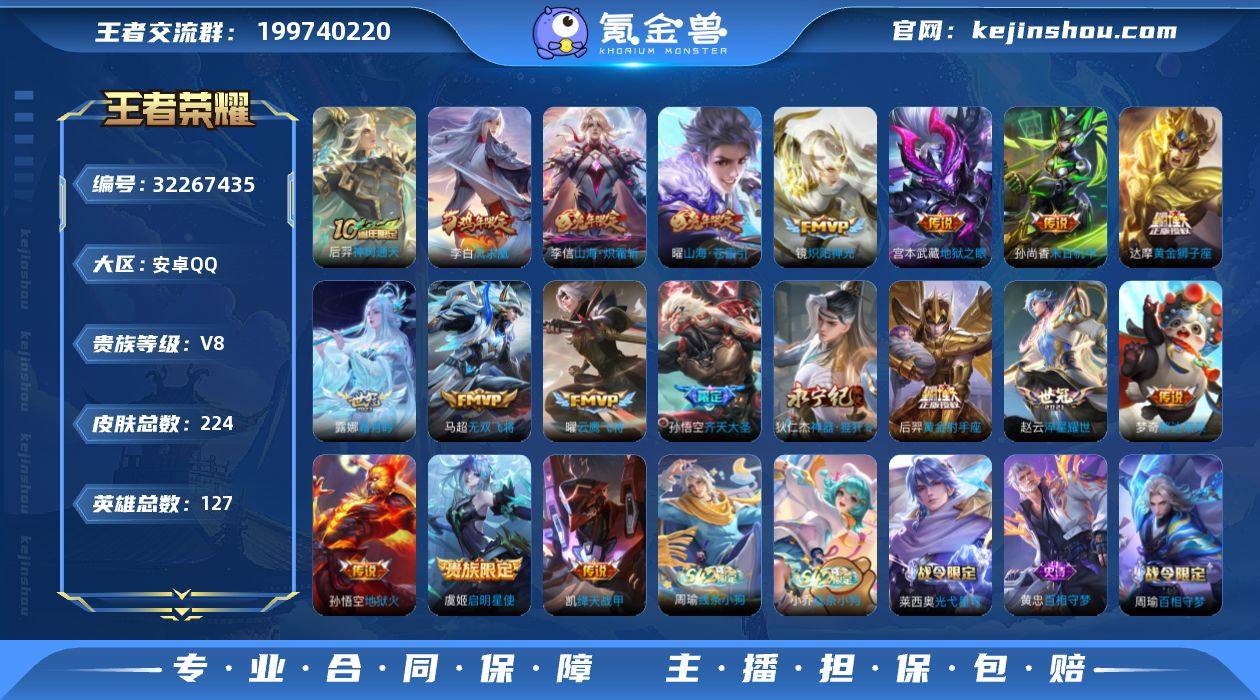 安卓Q-V8-最强王者段位-127英雄-224皮肤-20传说-53史诗【传说皮肤】:马超神骥逐星野,后羿神树通天,露娜霜月吟,孙悟空齐天大圣,曜山海苍雷引,李信山海炽霜斩,狄仁杰神器狴犴令,马超无双飞将,赵云淬星耀世,铠绛天战甲,镜炽阳神光,虞姬启明星使,曜云鹰飞将,达摩黄金狮子座,梦奇胖达荣荣,后羿黄金射手座,李白凤求凰,孙尚香末日机甲,宫本武藏地狱之眼,孙悟空地狱火【限定皮肤】:白起狰,狄仁杰阴阳师,虞姬凯尔特女王,赵云皇家上将,庄周高山流水,孙膑妖精王,扁鹊炼金王,芈月重明,周瑜赤莲之焰,元歌无心,夏侯惇朔风刀,曹操烛龙,典韦穷奇,马可波罗山海玄木吟,狄仁杰魔术师,狄仁杰神器狴犴令,项羽海滩派对,韩信飞衡,韩信傲雪梅枪,兰陵王驯魔猎人,孙悟空美猴王,孙悟空孙行者,孙悟空齐天大圣,李元芳云中旅人,虞姬启明星使,杨玉环遇见飞天,干将莫邪胡桃夹子,蔡文姬繁星吟游,太乙真人饕餮,鬼谷子原初探秘者,鬼谷子五谷丰年,百里玄策原初追逐者,弈星混沌棋,沈梦溪大漠名商,明世隐疑决卦,裴擒虎天狼狩猎者,裴擒虎李小龙,裴擒虎擒涛扼浪,狂铁御狮,米莱狄御霄,李信山海炽霜斩,盾山御銮,上官婉儿梁祝,嫦娥暖冬兔眠,曜山海苍雷引,鲁班大师探海日志,桑启海盐诗旅,暃星界游侠,阿古朵江河有灵,张良古海寻踪【年限皮肤】:孙悟空美猴王,李白凤求凰,韩信飞衡,曜山海苍雷引,李信山海炽霜斩,马可波罗山海玄木吟【赛季限定】:孙膑妖精王,扁鹊炼金王,虞姬凯尔特女王,白起狰,太乙真人饕餮,曹操烛龙,芈月重明,典韦穷奇,狂铁御狮,米莱狄御霄,盾山御銮,夏侯惇朔风刀,弈星混沌棋,明世隐疑决卦,鬼谷子原初探秘者,沈梦溪大漠名商,李元芳云中旅人,桑启海盐诗旅,裴擒虎擒涛扼浪,鲁班大师探海日志,张良古海寻踪,钟馗虚灵犬护,甄姬逆浪荇歌,亚瑟荣光...