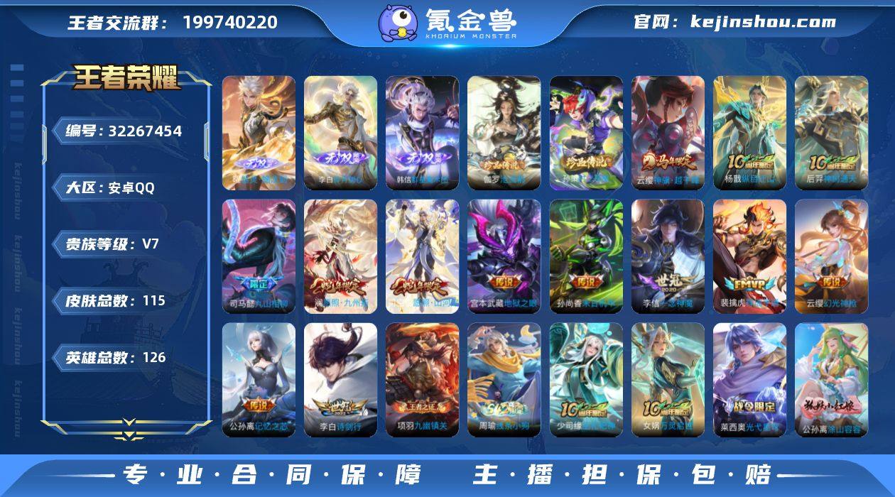 安卓Q-V7-最强王者段位-126英雄-115皮肤-3无双-2珍品传说-13传说-32史诗 【英雄全皮】:孙权全皮,敖隐全皮 【无双皮肤】:曜器灵螭龙剑,韩信群星魔术团,李白碎月剑心 【珍品传说】:伽罗沧流箭,孙策时之奇旅 【传说皮肤】:云缨神骥越千峰,杨戬纵目迁山,后羿神树通天,司马懿九山相柳,司空震愿照山河定,澜愿照九州拓,云缨幻光神枪,裴擒虎祥瑞亨通,公孙离记忆之芯,李白诗剑行,李信一念神魔,孙尚香末日机甲,宫本武藏地狱之眼 【限定皮肤】:狄仁杰阴阳师,赵云皇家上将,嬴政优雅恋人,狄仁杰魔术师,项羽海滩派对,张良古海寻踪,蒙恬荣光圣徽,鬼谷子天穹祈灯,李白碎月剑心,韩信群星魔术团 【年限皮肤】:司空震愿照山河定,澜愿照九州拓 【赛季限定】:张良古海寻踪,鬼谷子天穹祈灯,东皇太一噬灭天穹,太乙真人谧流熔炉,钟馗虚灵犬护,甄姬逆浪荇歌,亚瑟荣光之誓,蒙恬荣光圣徽,项羽九幽镇关 【战令限定】:百里守约百相守梦,老夫子百相守梦,刘禅鸭鸭历险记,沈梦溪鸭鸭历险记,莱西奥光弋星穹,明世隐往忆晖光,周瑜线条小狗 【史诗皮肤】:周瑜线条小狗,项羽九幽镇关,少司缘巫礼祀神,女娲万灵启世,莱西奥光弋星穹,公孙离涂山容容,黄忠百相守梦,后羿石田雨龙,狂铁龙之律动,刘禅鸭鸭历险记,赵怀真器灵浮梦炉,百里守约百相守梦,蒙恬荣光圣徽,杨戬天秀启明,狄仁杰鹰眼统帅,阿轲节奏热浪,李元芳逐浪之夏,百里守约特工魅影,雅典娜冰冠公主,亚瑟心灵战警,夏侯惇乘风破浪,花木兰水晶猎龙者,曹操幽灵船长,吕布圣诞狂欢,妲己魅力维加斯,嬴政暗夜贵公子,嬴政优雅恋人,孙尚香水果甜心,宫本武藏鬼剑武藏,狄仁杰魔术师,赵云皇家上将,露娜紫霞仙子,鲁班七号电玩小子 【其他皮肤】:兰陵王雾影缉谜,蒙恬苍云破阵,虞姬溯影追猎,蚩奼极光幻客,曹操逐霄之志,艾琳鹤...