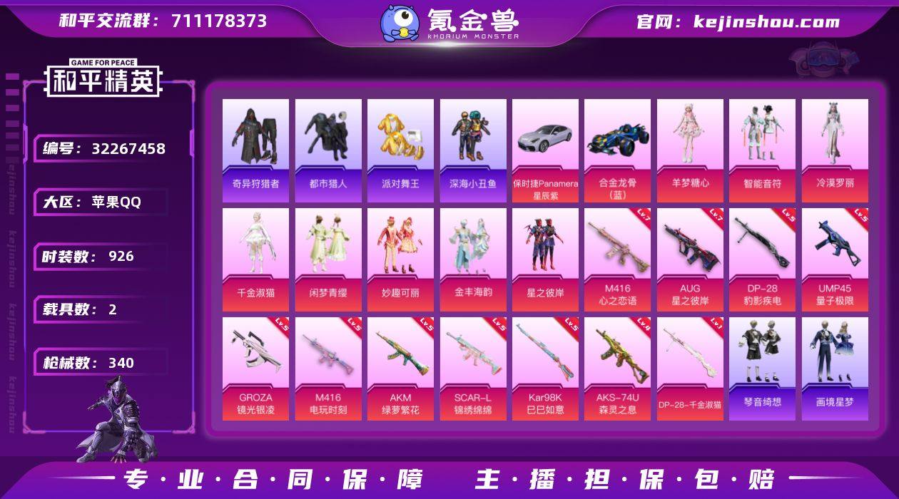 【特价出售】苹果Q-5稀有2载具8粉装14特效枪24热门253套装340枪皮 109090热力值 21印记 历史无敌战神 【5稀有】 奇异狩猎者 都市猎人 浪漫天命 派对舞王 派对舞王(金靴子) 【2载具】 保时捷Panamera(星辰紫) 合金龙骨蓝色 【8粉装】 千金淑猫 金丰海韵 冷漠罗丽 羊梦糖心 闲梦青缨 妙趣可丽 智能音符 星之彼岸 【14特效枪】 SCAR-L-锦绣绵绵 (5级) M416-心之恋语 (7级) M416-电玩时刻 (5级) AKS-74U-森灵之息 (4级) AKM-绿萝繁花 (5级) Kar98K-巳巳如意 (5级) DP-28-千金淑猫 (1级) DP-28-豹影疾电 (5级) UMP45-量子极限 (5级) GROZA-镜光银凌 (5级) AUG-星之彼岸 (7级) AKS-74U-森灵之息 (4级) Mk14-福马献瑞 (4级) 平底锅-喜羊羊与灰太狼 (7级) 【24热门】 8号机 Mark.06 小丑鱼 龟仙人 呆萌铁蟹 鹰眼刺客 激萌罗小黑 迅捷狂鲨 深海小丑鱼 大橘为重 浪漫波比 暗影哥特 迪迦奥特曼 团圆交子 瑞龙福将 漫步者 机械英豪 破蛋小黄鸡 风华少年志 白月香洋装 极速红龙 英勇保护者 弄潮海豚 M762-瑞龙福将 【2飞行器】 繁花小夜曲飞行翼 星之彼岸飞行器 【2头盔】 国宝胖达头盔 深海小丑鱼头盔 【3背包】 百万伏特背包 萌熊伴侣背包 甜蜜誓约背包