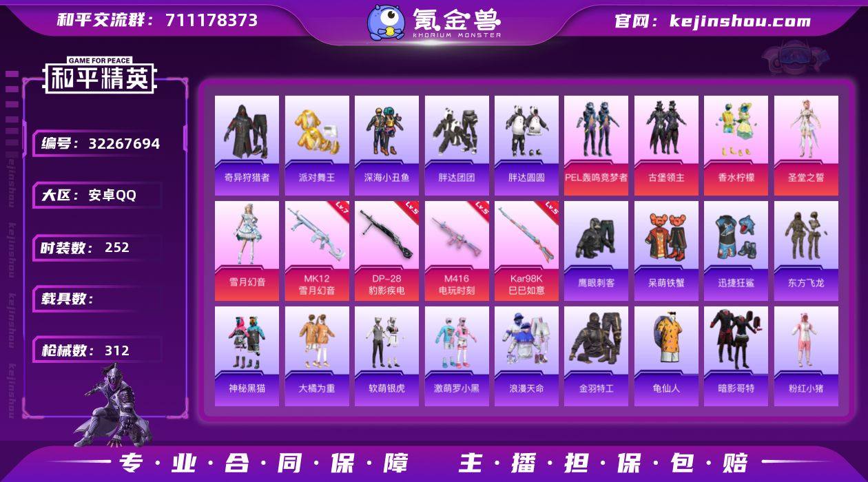 安卓手Q-2王牌印记-5粉装-5特效枪-1载具-47238热力值-114套装-120枪皮-0卓越印记-0传奇印记【5粉装】,新星烈龙,古堡领主,天禅智恒,彗云及圣,幻彩马卡龙【5特效枪】AKM-炫紫旋律-4级 M416-心之恋语-4级 M762-甜蜜誓约-4级 Kar98K-伏魔团-2级 AWM-花间之火-4级 【4稀有紫装】,暗影哥特,雪山精英,浪漫波比,金羽特工,【1稀有载具】,合金龙骨(蓝),【114稀有时装】,SS33特训,雪山精英,暗影哥特,金羽特工,浪漫波比,好奇恐龙,香桃花海,迷域探索者,机械征服者,SS5特训,红酒骑士,决胜时刻,蔷薇魔法师,冰川谧蓝,黑色刀锋,福星高照,暗夜契约,纯白誓言,夏日音浪,PEC最牛战神,SS8特训,众神之王,智慧之神,萌黄之夏,黄色格斗者,PEL躁动竞梦者,特训学院,红色运动,白色伏地魔,SS9特训,神秘舞者,丝绸行者,酷萌兔限定,黑色伏地魔,骑行爱好者,蓝色守护者,猛禽,荷鲁斯之眼,竞技勇士朋克,时尚圣诞,特战装甲,乘风破浪,战地菁英,灰色格斗者,甜蜜告白,本愿之火,辉星之火,怒火燎原,魅力单车,雪山征服者,夜莺强袭者,丛林猎人,传奇侦探,浪漫假日,甜蜜菠萝,街舞之王,粉甜马卡龙,突袭者,青春校园,牛气满满,冰川特警,龙腾端午,沙漠毒蛇,SS11特训,人气偶像,疯狂小兔子,青龙圣者,圣诞大吉,玄武圣者,熔岩使者,朱雀圣者,凛冬战士,白虎圣者,北国孤狼,SS6特训,拳皇97草薙京,神秘领域,炽焰拳师,格斗专家,耀眼新星,坚韧舞者,竞技达人朋克,原初圣火,暗夜武装,超能勇士,逆风勇士,跃动心情,初火先锋,SS7特训,核芯基因,精神漫游,霓虹街区,SS10特训,风行保卫者,镭射皇者,风华少年志,SS12特训,牛气冲天,银白舞王,SS13特训,缤纷果语,SS14特训,格斗先锋,游猎者,刚毅裁决者,海上生明月,SS15特训,舞夜骑士,深蓝冒险家,【120稀有枪械】,M416-心之恋语/4级,AKM-炫紫旋律/4级,M762-甜蜜誓约/4级,Kar98K-伏魔团/2级,AWM-花间之火/4级,Famas-乌木金纹,M416-红色方程式,M4...