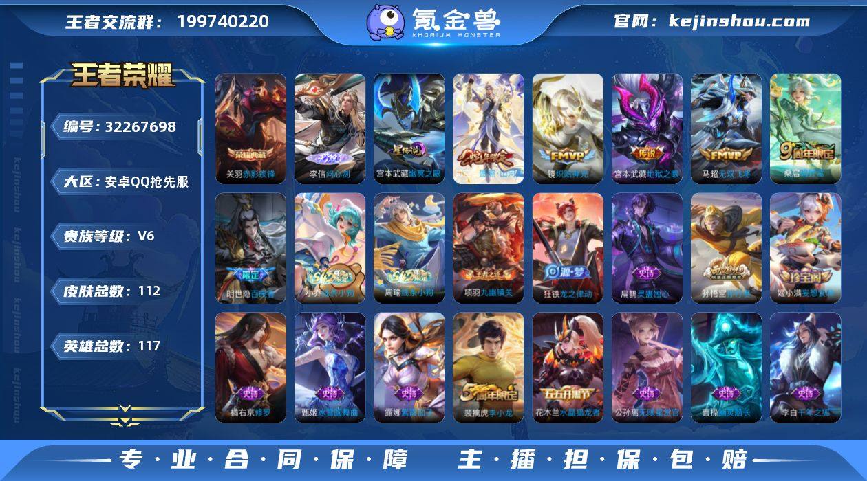 贵族等级:V6 典藏皮肤数:1 珍品无双皮肤数:0 无双皮肤数:1 珍品传说皮肤数:0 传说皮肤数:5 史诗皮肤数:32 皮肤数:112 英雄数:117 段位:至圣王者 卖家说:14,500马超,13,000司空震,1万分李信