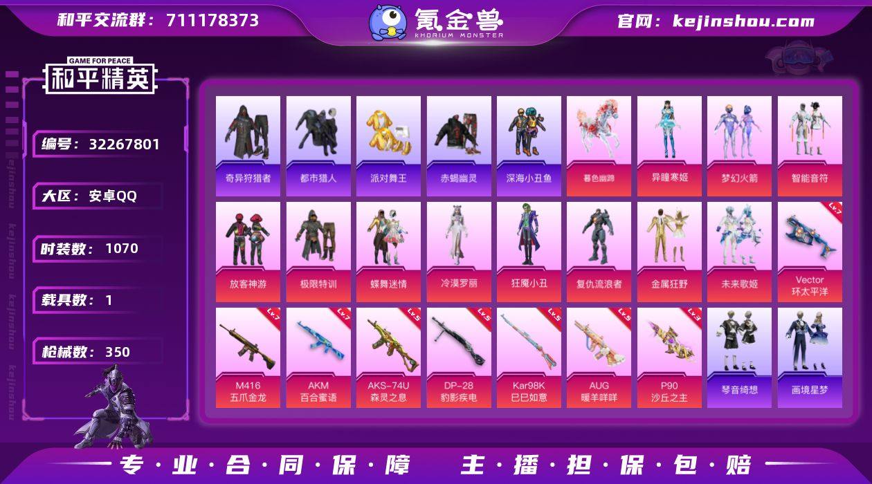 【特价出售】钱包不能注销安卓Q-6稀有1载具11粉装11特效枪32热门267套装350枪皮 108048热力值 18印记 历史绝世王牌18星 【6稀有】 奇异狩猎者 赤蝎幽灵 都市猎人 浪漫天命 派对舞王 派对舞王(金靴子) 【1载具】 暮色幽蹄 【11粉装】 梦幻火箭 蝶舞迷情 狂魇小丑 异瞳寒姬 未来歌姬 冷漠罗丽 金属狂野 智能音符 放客神游 极限特训 复仇流浪者 【11特效枪】 M416-五爪金龙 (7级) P90-沙丘之主 (3级) AKS-74U-森灵之息 (5级) Kar98K-巳巳如意 (5级) AKM-百合蜜语 (7级) DP-28-豹影疾电 (5级) AUG-暖羊咩咩 (5级) AKS-74U-森灵之息 (5级) Mk14-福马献瑞 (5级) ACE32-萌骑漫游 (5级) Vector-环太平洋 (7级) 【32热门】 小丑鱼 龟仙人 青涩年华 雪山精英 东方飞龙 梦魇先生 万圣娃娃 鹰眼刺客 好奇恐龙 迅捷狂鲨 深海小丑鱼 浪漫波比 金羽特工 TT战队服 梦起落英 神秘黑猫 暗影哥特 迪迦奥特曼 团圆交子 瑞龙福将 豚鼠丹丹 忍者信条 西部牛仔 水银刺客 狂沙舞者 漫步者 冰爽海盐 破蛋小黄鸡 风华少年志 M762-瑞龙福将 M24-奇异狩猎者 S686-奇异狩猎者 【1飞行器】 星之彼岸飞行器 【3头盔】 梦幻火箭头盔 幻影战神头盔 马卡龙头盔 【5背包】 酷熊伴侣背包 幻影战神背包 静灵氛围背包 神秘黑猫背包 马卡龙背包