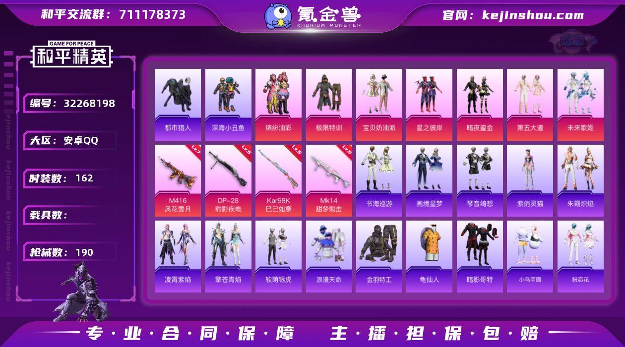 安卓 手Q-7粉装-5特效枪-0载具-2粉色飞行器-55895热力值-8王牌印记-162套装-190枪皮 【热门品类】:粉装-缤纷油彩,套装-浪漫天命,套装-都市猎人,套装-深海小丑鱼,套装-金羽特工,套装-龟仙人,套装-暗影哥特 【粉色套装】:粉装-极限特训,粉装-宝贝奶油派,粉装-缤纷油彩,粉装-星之彼岸,粉装-暗夜鎏金,粉装-第五大道,粉装-未来歌姬 【粉色枪皮等级】:M416-风花雪月(七级),AKS-74U-森灵之息(五级),Kar98K-巳巳如意(五级),Mk14-甜梦熊击(五级),DP-28-豹影疾电(五级) 【粉色枪皮】:M416-风花雪月,AKS-74U-森灵之息,Kar98K-巳巳如意,Mk14-甜梦熊击,DP-28-豹影疾电 【粉色飞行器】:歌者泠鸢飞行器 【粉色降落伞】:极限特训降落伞,碧影闪光降落伞,橘柚倾心降落伞,彩虹甜喵降落伞,音爆索尼克降落伞,第五大道降落伞,未来歌姬降落伞,炫光之旅降落伞,莲影清波降落伞,桃粉嫣然降落伞 【稀有套装】:套装-龟仙人,套装-小鸟芋圆,套装-粉恋花,套装-紫幽梦,套装-蓝冰羽,角色-瑰梦爱神,套装-虚空漩涡,套装-云朵鹅,套装-雪绒豹,角色-乐音,角色-绛羽幽主,套装-朱霞炽焰,套装-凌霄紫焰,套装-擎苍青焰,角色-紫俏灵猫,套装-书海巡游,套装-画境星梦,套装-琴音绮想,套装-红釉青花,角色-曹焱兵 【稀有枪皮】:AKM-彩虹符号,AKM-恐龙拽拽,AKM-破晓战魂,AKM-虎虎生威,AKM-龙的传人,M16A4-红色方程式,M16A4-蓝色火焰,SCAR-L-夜灯,SCAR-L-玉兔迎春,SCAR-L-红色方程式,SCAR-L-银碳小老虎,SCAR-L-黄金龙骨,M416-糯团青竹,M416-红色方程式,M416-蓝色火焰,GROZA-异彩先驱,GROZA-影袭,GROZA-恐龙拽拽,GROZA-懵萌河马,GROZA-田园牧歌,GROZA-蓝莓炮弹,AUG-天降萌叽,AUG-耀粉歌者,AUG-青春冒险家,QBZ-彩虹符号,QBZ-未来歌姬,QBZ-飞驰魅影,M762-天降萌叽,M762-彩虹甜喵,...