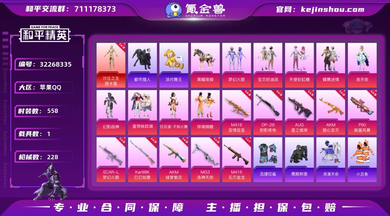 【特价出售】苹果Q-1红装6稀有1载具9粉装12特效枪13热门145套装228枪皮 74453热力值 12印记 历史超级王牌21星 【1红装】 沙丘之主-图卡盟 (3级) 【6稀有】 M416-黄金龙骨 AWM-黄金龙骨 都市猎人 浪漫天命 派对舞王 派对舞王(金靴子) 【1载具】 黑曜夜骑 【9粉装】 梦幻火箭 蝶舞迷情 狂花道·不知火舞 宝贝奶油派 天使彩虹糖 洛天依 星穹咏叹调 幻影战神 祥瑞锦鲤 【12特效枪】 SCAR-L-梦幻火箭 (5级) M416-五爪金龙 (1级) M416-灵猫魔法师 (3级) AKM-甜心宝贝 (5级) AKM-绿萝繁花 (5级) Kar98K-巳巳如意 (5级) DP-28-豹影疾电 (5级) P90-能量风暴 (5级) AUG-星之彼岸 (5级) M416-至情至圣 (9级) MG3-洛神天依 (5级) Mk14-福马献瑞 (5级) 【13热门】 小丑鱼 龟仙人 浪漫假日 鹰眼刺客 迅捷狂鲨 忍者信条 水银刺客 漫步者 破蛋小黄鸡 极速红龙 军刀雅典娜 弄潮海豚 S686-奇异狩猎者 【2飞行器】 繁龙极客飞行器 千面幻镜飞行器 【5头盔】 童趣迷兔头盔 梦幻火箭头盔 甜心宝贝头盔 幻影战神头盔 金羽特工头盔 【5背包】 甜心宝贝背包 幻影战神背包 深海小丑鱼背包 金羽特工背包 甜蜜誓约背包