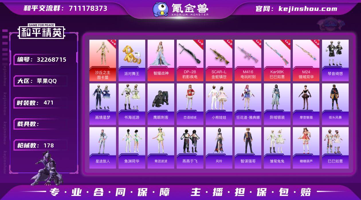 【特价出售】苹果Q-1红装2稀有1粉装6特效枪7热门129套装178枪皮 59340热力值 13印记 历史超级王牌17星 【1红装】 沙丘之主-图卡盟 (4级) 【2稀有】 派对舞王 派对舞王(金靴子) 【1粉装】 智耀战神 【6特效枪】 SCAR-L-金蛇镇世 (5级) M416-电玩时刻 (5级) Kar98K-巳巳如意 (5级) DP-28-豹影疾电 (5级) M24-镜域双华 (3级) Mk14-福马献瑞 (5级) 【7热门】 Mark.06 龟仙人 鹰眼刺客 粉红小猪 破蛋小黄鸡 弄潮海豚 M416-仓鼠灰灰 【1飞行器】 龙翔九天飞行器