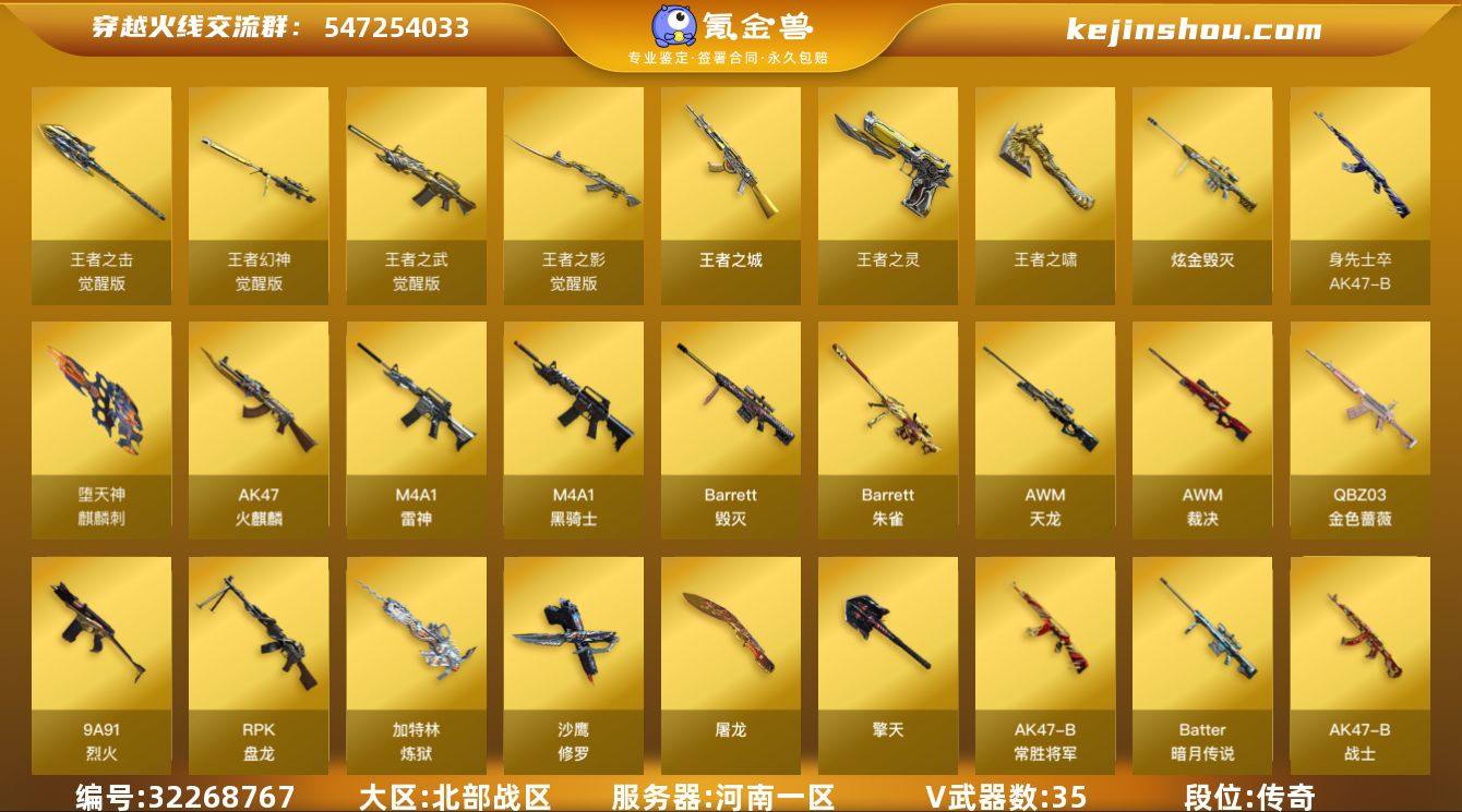 河南一区-40V-11王者武器数-1炫金武器数 【热门武器】:QBZ03-金色蔷薇,M4A1-黑骑士,RPK-盘龙*4,加特林-炼狱*3,沙鹰-修罗 【王者炫金武器】:王者之城,王者之灵,王者之啸,炫金毁灭,王者之魄高爆手雷*2,王者之魄闪光弹*2 【音效卡】:M4A1-雷神音效卡,M4A1-黑骑士音效卡 【皮肤】:雷神-冠军之魄,火麒麟-雷神,毁灭耀金皮肤,黑骑士-暗月,黑骑士-CFS2021,战神-粉色甜心皮肤,AK47-B-常胜将军-曹操*2,AK47-B-常胜将军-刘备,修罗-星空 【角色】:葵,王者-葵-貂蝉,王者玲珑,娟娟,灵狐者-职业经理,潘多拉-X,潜龙队-X,青霞仙子,蜀雪,王者-零-传说之路 【人偶武器】:天龙-曼陀罗,迷你牛魔王,闪光弹-小乔*2,闪光弹-貂蝉,高爆手雷-大乔 【英雄级武器】:AK47-火麒麟,M4A1-雷神,M4A1-黑骑士,QBZ03-金色蔷薇,9A91-烈火,王者之影-觉醒版,王者之武-觉醒版,AK-47-猩红传说*2,AK47-B-战神,AK47-B-常胜将军,AK47-B-身先士卒,AK47-B-战士*2,AWM-天龙,Barrett-毁灭,AWM-裁决,Barrett-朱雀,王者幻神-觉醒版,Barrett-暗月传说*3,RPK-盘龙*4,加特林-炼狱*3,沙鹰-修罗,屠龙,麒麟刺-堕天神,擎天,王者之击-觉醒版,高爆手雷-堕天神,高爆手雷-幻灵,闪光弹-堕天神,闪光弹-幻灵,烟雾弹-堕天神 【源级武器】:源-千变,源·火麒麟*2,御·火麒麟-平天大圣,火麒麟-雷神,源-黑龙,源·雷神*2,魂·M4A1-雷神-化蛇,御·雷神-烈虎,御·雷神-葫芦兄弟,灵·黑骑士-破界 I,源·无影,源·天启,源·超新星,御·超新星-圣诞,源·青龙,魂·HK417-朱雀-凤灵,源·天龙,魂·裁决-凤灵,御·毁灭-葫芦兄弟,魂·Barrett-金色蔷薇-蛇姬,魂·炼狱-玩具枪,御·炼狱-女娲,魂·擎天-蒸汽钟表,源·龙啸 【道具】:超级背包,绿色巨人,灵魂忍者,变异宝贝,迷雾幽灵,夺命之镰,防化服*2,枪王排位29赛季金色...
