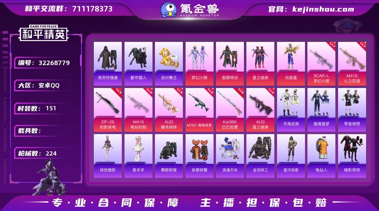 【秒换绑】安卓 手Q-1神装-4粉装-11特效枪-0载具-6粉色飞行器-71288热力值-18王牌印记-151套装-224枪皮 【红色神装等级】:暮色玫影-艾丽娅(二级) 【红色角色神装】:暮色玫影-艾丽娅 【热门品类】:粉装-梦幻火箭,套装-浪漫天命,套装-都市猎人,套装-派对舞王,套装-奇异狩猎者,套装-金羽特工,套装-星河浪客,套装-龟仙人,套装-暗影哥特,套装-粉红小猪,熔岩游骑兵连帽夹克 【粉色套装】:粉装-极限特训,粉装-梦幻火箭,粉装-星之彼岸,角色-光极星 【粉色枪皮等级】:AKM-暮色玫影(三级),SCAR-L-梦幻火箭(七级),M416-心之恋语(七级),M416-电玩时刻(五级),AUG-星之彼岸(三级),AUG-暖羊咩咩(五级),M762-青锋波束(五级),AKS-74U-森灵之息(五级),Kar98K-巳巳如意(五级),Mk14-福马献瑞(五级),DP-28-豹影疾电(五级) 【粉色枪皮】:AKM-暮色玫影,SCAR-L-梦幻火箭,M416-心之恋语,M416-电玩时刻,AUG-星之彼岸,AUG-暖羊咩咩,M762-青锋波束,AKS-74U-森灵之息,Kar98K-巳巳如意,Mk14-福马献瑞,DP-28-豹影疾电 【粉色飞行器】:炫彩糖果飞行器,梦幻火箭飞行器,星之彼岸飞行器,终晖之翼飞行器,暮色之舞飞行器 【粉色降落伞】:极限特训降落伞,梦幻火箭降落伞,星之彼岸降落伞,筑梦精灵降落伞,精灵梦叶罗丽降落伞,创世·救赎降落伞,圣斗士星矢降落伞,最终圣卫者降落伞,喜羊羊与灰太狼降落伞,异瞳寒姬降落伞,炫彩糖果降落伞,暮色玫影降落伞 【稀有套装】:套装-龟仙人,套装-巳巳如意,套装-雪国风尚,套装-炫彩糖果,套装-马上来财,套装-雏菊兔兔,套装-萝兰蝴蝶,套装-小熊娃娃,套装-糖糖葫芦,套装-青团波波,套装-棉花软糖,套装-燕燕于飞,套装-鱼渊荷华,套装-粉恋花,套装-紫幽梦,套装-蓝冰羽,套装-彩虹兔,套装-云朵鹅,套装-雪绒豹,玩偶服-美羊羊,角色-绯色魅影,套装-书...