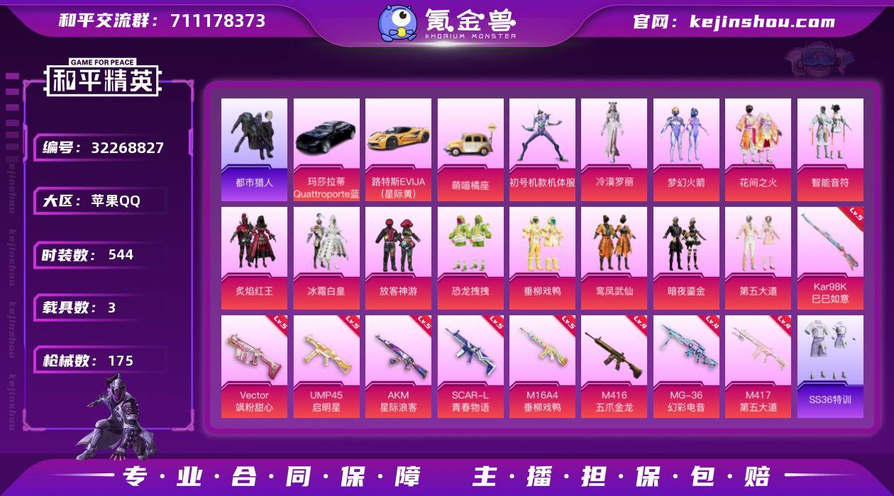DB2808 苹果Q区 可改实名可转区 13粉 9特 3载具 1绝世 27地铁天赋点(63级卓越收藏家) 紫螳螂 新101 放客 都市 花间之火 第五大道 老六服 暗影哥特 浪漫天命 4级M4五爪金龙 玛莎 路特斯 萌喵橘座 苹果手Q-10王牌印记-13粉装-9特效枪-3载具-64951热力值-143套装-175枪皮-1卓越印记-1传奇印记 【13粉装】角色-冷漠罗丽,套装-炙焰红王,套装-梦幻火箭,套装-冰霜白皇,套装-智能音符,套装-鸾凤武仙,套装-垂柳戏鸭,套装-第五大道,套装-花间之火,套装-放客神游,角色-初号机款机体服,套装-暗夜鎏金,套装-恐龙拽拽 【9特效枪】SCAR-L-青春物语/5级,Vector-飒粉甜心/5级,UMP45-启明星/5级,M416-五爪金龙/4级,AKM-星际浪客/5级,MG-36-幻彩电音/4级,M417-第五大道/4级,M16A4-垂柳戏鸭/5级,Kar98K-巳巳如意/5级 【7稀有紫装】都市猎人,暗影哥特,浪漫天命,雪山精英,明日香款战斗服,龟仙人,零款战斗服 【3稀有载具】玛莎拉蒂Quattroporte(夜幕蓝),萌喵橘座,路特斯EVIJA(星际黄) 【143稀有时装】梦幻火箭,初号机款机体服,智能音符,放客神游,花间之火,第五大道,冷漠罗丽,SS35特训,SS31特训,SS33特训,SS32特训,SS36特训,SS34特训,都市猎人,浪漫天命,龟仙人,雪山精英,暗影哥特,零款战斗服,明日香款战斗服,萌鸡速递,恐龙拽拽,垂柳戏鸭,鸾凤武仙,冰霜白皇,炙焰红王,暗夜鎏金,狂沙舞者,Alan Walker,街头风暴,星途旅人,SS30特训,海琴烟,战术大师,智谋强哥,SS28特训,SS29特训,SS5特训,无暇誓言,智慧隐士,拳皇97八神庵,拳皇97夏尔美,龙的传人,SS8特训,甜梦熊熊,青玉碎影,萌黄之夏,青年教官,蓝色运动,白色伏地魔,SS9特训,绯格组合,涂山之恋,SS26特训,TT战队服,漫步者,空岛之星,竞技名士,深蓝色名流,猛禽,长空猛禽,竞技勇士朋克,战地菁英,旭日情侣,甜蜜告白,怒火燎原,冷焰舞者,惊鸿侠骨,魅力单车,夜莺强袭者,猎梦纪元,丛林猎人,甜心亚梦,虚音...