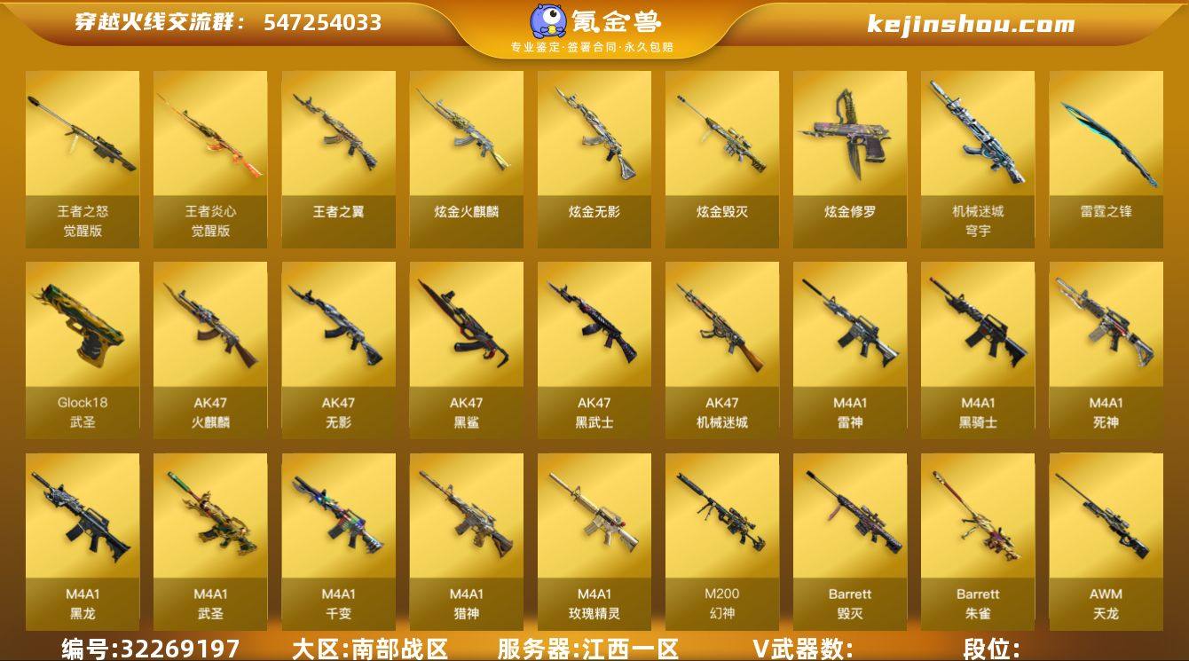 南部战区(江西一区)lb【爆破号】传说【传说暗裔】72v【M200-幻神+皮/黄忠,武圣套装,QBZ03-金色蔷薇,ScarLight-白虎,AWM-裁决,4烈龙+3炼狱+死亡之眼,Barrett-毁灭套+皮/冠军之怒,Colt1911-大黄蜂】3王者【王者炎心,王者之怒,王者之翼】4炫金【炫金火麒麟,炫金无影,炫金毁灭,炫金修罗】4角色【王者樱-热浪之夏,葵,樱,炫,职业选手】4音效【AK47-火麒麟音效卡,M4A1-雷神音效卡,Barrett-毁灭音效卡,Barrett-碧霄极光音效卡】21皮【幻神-黄忠,毁灭-冠军之怒,雷神-星空,毁灭-星空,雷神-耀金,无影-耀金,火麒麟-华夏之心,火麒麟-AG战队,炼狱-星空,火麒麟-CF STAR,天龙-CF STAR】【VIP3】 截图展示段位不代表实际段位 如赛季更新等不可抗拒因素发生变化、时限道具不保证所剩时间