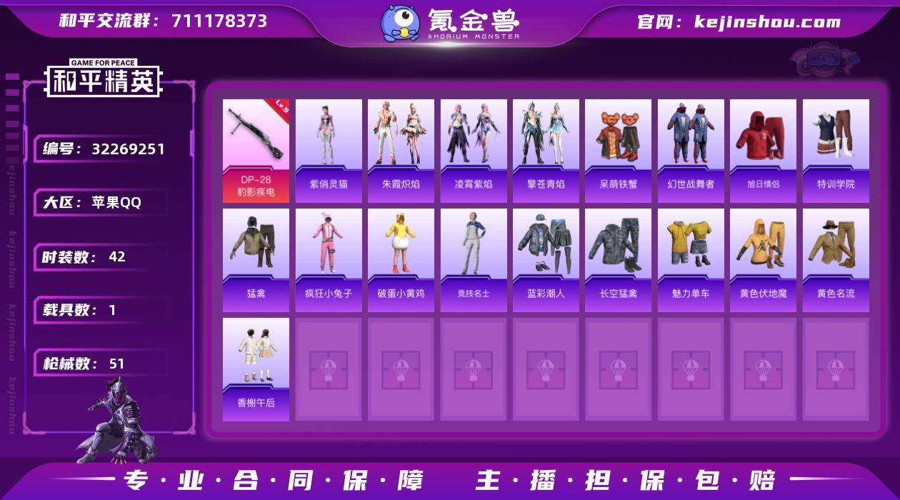 苹果 手Q-10粉装-7特效枪-1载具-2粉色飞行器-70854热力值-6王牌印记-134套装-224枪皮 【热门品类】:角色-忠义严颜,套装-龟仙人,大砍刀-青龙偃月刀 【粉色载具】:萌喵橘座 【粉色套装】:粉装-飓风飞鹰,粉装-千面幻镜,粉装-寒光使者,角色-阿尔茜,粉装-闲梦青缨,角色-宙之时溯,角色-星云暗核,粉装-莲影清波,玩偶服-猪猪侠,角色-荧海星豚 【粉色枪皮等级】:AKM-绿萝繁花(五级),SCAR-L-梦幻火箭(七级),M416-超新星(三级),Kar98K-巳巳如意(五级),Mk14-精灵梦叶罗丽(七级),DP-28-豹影疾电(五级) 【粉色枪皮】:AKM-绿萝繁花,SCAR-L-梦幻火箭,M416-超新星,Kar98K-巳巳如意,Mk14-闲梦青缨,Mk14-精灵梦叶罗丽,DP-28-豹影疾电 【粉色飞行器】:梦幻火箭飞行器,超新星飞行器 【粉色降落伞】:甜心宝贝降落伞,甜蜜誓约降落伞,齐天大圣降落伞,天之羽翼降落伞,百合蜜语降落伞,环太平洋降落伞,闲梦青缨降落伞,萌物绒绒降落伞,炫光之旅降落伞,莲影清波降落伞,龙行天下降落伞,圣堂之誓降落伞,守护天翼降落伞,樱桃泡泡降落伞,荧海星豚降落伞 【稀有套装】:套装-龟仙人,套装-雏菊兔兔,套装-萝兰蝴蝶,套装-小熊娃娃,角色-狂花道·雅典娜,套装-糖糖葫芦,套装-青团波波,角色-俏兔智灵,套装-星渊小夜曲,套装-彩虹兔,套装-云朵鹅,套装-雪绒豹,套装-朱霞炽焰,套装-凌霄紫焰,玩偶服-懒羊羊 【稀有枪皮】:AKM-冰凉西瓜,AKM-夜灯,AKM-灼热熔岩,AKM-破晓战魂,AKM-萌趣颜团子,AKM-虎虎生威,AKM-霓虹街区,AKM-龙的传人,M16A4-甜心亚梦,M16A4-红色方程式,M16A4-莲影清波,M16A4-蓝色火焰,SCAR-L-炫彩节奏,SCAR-L-玉兔迎春,SCAR-L-甜蜜誓约,SCAR-L-粉色回忆,SCAR-L-红色方程式,M416-摩登王国,M416-糯团青竹,M416-红色方程式,M416-绯红前夜,M416-蓝色火焰,GROZA-彩虹符...