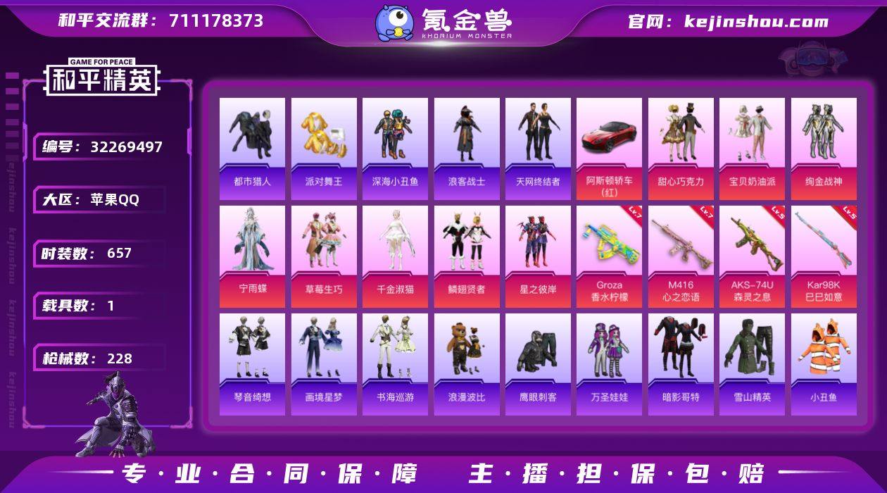 【特价出售】苹果Q-4稀有1载具8粉装8特效枪29热门166套装228枪皮 71597热力值 11印记 历史超级王牌17星 【4稀有】 都市猎人 派对舞王 天网终结者 派对舞王(金靴子) 【1载具】 阿斯顿马丁S红色 【8粉装】 宁雨蝶 宝贝奶油派 甜心巧克力 千金淑猫 鳞翅贤者 草莓生巧 绚金战神 星之彼岸 【8特效枪】 M416-心之恋语 (7级) AKS-74U-森灵之息 (5级) Kar98K-巳巳如意 (5级) GROZA-香水柠檬 (7级) 信号枪-金乌曜日 (2级) AKS-74U-森灵之息 (5级) Mk14-福马献瑞 (5级) AA12-G-萌骑幻想 (2级) 【29热门】 小丑鱼 龟仙人 雪山精英 晶辉守护 万圣娃娃 鹰眼刺客 深海小丑鱼 浪漫波比 浪客战士 暗夜契约 怪笑疯兔 暗影哥特 团圆交子 瑞龙福将 粉红小猪 漫步者 冰爽海盐 白虎圣者 蓝甜马卡龙 娴静芝兰 静谧青瓷 机械英豪 破蛋小黄鸡 风华少年志 极速红龙 M416-仓鼠灰灰 M762-奇异狩猎者 M762-瑞龙福将 Kar98K-古堡领主 【1飞行器】 梦幻火箭飞行器 【4头盔】 梦幻火箭头盔 甜心宝贝头盔 百万伏特头盔 深海小丑鱼头盔 【4背包】 甜心宝贝背包 智能音符背包 甜蜜誓约背包 马卡龙背包