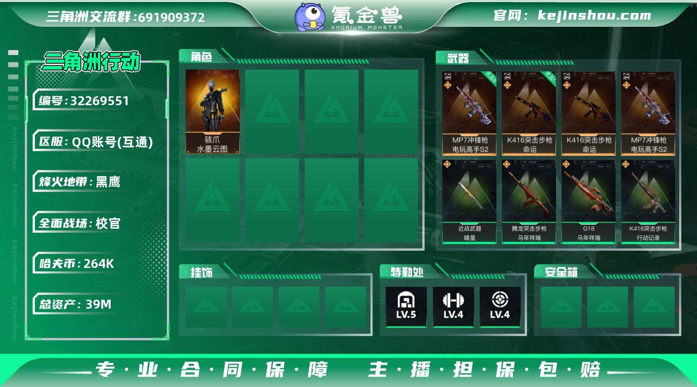 39m总资产-2640k哈伏币-56烽火等级-黑鹰-41战场等级-校官 【干员外观】:骇爪-水墨云图 【近战皮肤】:近战-暗星,近战-处刑者2级,近战-黑鹰 【典藏外观】:K416突击步枪-命运,MP7冲锋枪-电玩高手S2 【典藏外观成色】:K416突击步枪-命运(优品C),MP7冲锋枪-电玩高手S2(优品B) 【传说外观】:K416突击步枪-行动记录,SCAR-H战斗步枪-水墨云图,SCAR-H战斗步枪-荼蘼,腾龙突击步枪-马年祥瑞,腾龙突击步枪-万金泪冠,MK47突击步枪-暗星,SR-3M紧凑突击步枪-暗星,SR-3M紧凑突击步枪-荼蘼,勇士冲锋枪-万金泪冠,PKM通用机枪-荼蘼,M14射手步枪-蛮荒,M14射手步枪-缄花,SR-25射手步枪-缄花,AWM狙击步枪-万金泪冠,.357左轮-缄花,G18-马年祥瑞 【史诗外观】:K416突击步枪-冬日风情,K416突击步枪-腊梅,SG552突击步枪-哈夫克警备,SMG-45冲锋枪-阿萨拉特攻,勇士冲锋枪-丛影谍踪,MP7冲锋枪-六套之力,725双管霰弹枪-炽焰,PKM通用机枪-阿萨拉特攻,M249轻机枪-丛影谍踪,QJB201轻机枪-炽焰,VSS射手步枪-丛影谍踪, M14射手步枪-航天庆典 【稀有外观】:AS Val突击步枪-休闲时光,SCAR-H战斗步枪-休闲时光,AKS-74U突击步枪-休闲时光,PSG-1射手步枪-休闲时光*2,K416突击...