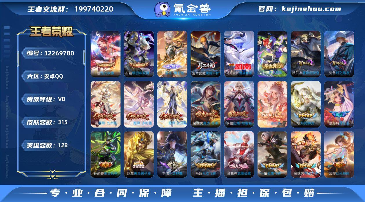 贵族等级:V8 典藏皮肤数:2 珍品无双皮肤数:0 无双皮肤数:1 珍品传说皮肤数:3 传说皮肤数:25 史诗皮肤数:99 皮肤数:315 英雄数:128 段位:王者
