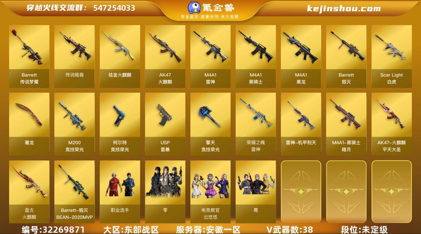 安徽一区-41V-1王者-1炫金 【传说武器】:传说暗裔,传说梦魇 【热门武器】:传说暗裔,传说梦魇,Scar Light-白虎*3,M200-竞技荣光,M4A1-黑骑士,裁决-雪莉杨,USP-雷暴 【王者炫金武器】:炫金火麒麟 【音效卡】:绝迹语音包 【皮肤】:雷神-荣耀之魄,雷神-机甲刑天皮肤,火麒麟-平天大圣,火麒麟-盘古,毁灭-BEAN-2020MVP,黑骑士-暗月*2 【角色】:零,电竞教官-云悠悠,鹰,风暴女,虎妞,娟娟,樱-战斗天使,职业选手 【人偶武器】:裁决-雪莉杨 【挑战大师】:冰龙粉碎者-白马银枪*2,激光毁灭者III-白马银枪*2 【英雄级武器】:AK47-火麒麟,M4A1-黑龙,M4A1-雷神,M4A1-黑骑士,Scar Light-白虎*3,Barrett-毁灭,M200-竞技荣光,王者星神-觉醒版,USP-雷暴,柯尔特-竞技荣光*3,屠龙,擎天-竞技荣光*3,高爆手雷-竞技荣光*7,闪光弹-竞技荣光*7,烟雾弹-竞技荣光*7 【道具】:亚洲杯纪念炫彩背包,炫彩背包,超级背包,绿色巨人,灵魂忍者,迷雾幽灵,夺命之镰,防化服*2,枪王排位29赛季金色流光,EP战队名片,防弹头盔*4,防弹衣*4,C4工具钳*4,手雷包*4 【特殊枪械】:3白虎,1黑骑士