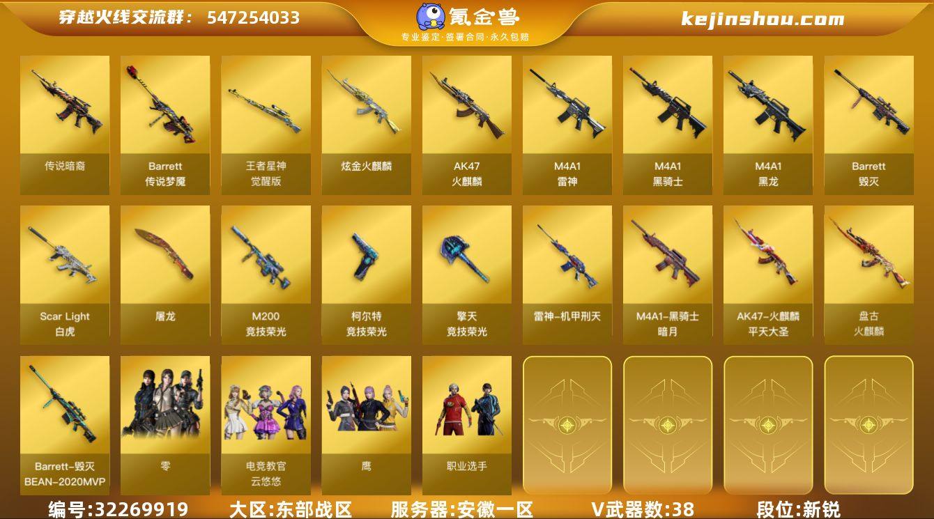 【穿越火线CF-3404】安徽一区-41V-1王者-1炫金 【传说武器】:传说暗裔,传说梦魇 【热门武器】:传说暗裔,传说梦魇,Scar Light-白虎*3,M200-竞技荣光,M4A1-黑骑士,裁决-雪莉杨,USP-雷暴 【王者炫金武器】:炫金火麒麟 【音效卡】:绝迹语音包 【皮肤】:雷神-荣耀之魄,雷神-机甲刑天皮肤,火麒麟-平天大圣,火麒麟-盘古,毁灭-BEAN-2020MVP,黑骑士-暗月*2 【角色】:零,电竞教官-云悠悠,鹰,风暴女,虎妞,娟娟,樱-战斗天使,职业选手 【人偶武器】:裁决-雪莉杨 【挑战大师】:冰龙粉碎者-白马银枪*2,激光毁灭者III-白马银枪*2 【英雄级武器】:AK47-火麒麟,M4A1-黑龙,M4A1-雷神,M4A1-黑骑士,Scar Light-白虎*3,Barrett-毁灭,M200-竞技荣光,王者星神-觉醒版,USP-雷暴,柯尔特-竞技荣光*3,屠龙,擎天-竞技荣光*3,高爆手雷-竞技荣光*7,闪光弹-竞技荣光*7,烟雾弹-竞技荣光*7 【道具】:亚洲杯纪念炫彩背包,炫彩背包,超级背包,绿色巨人,灵魂忍者,迷雾幽灵,夺命之镰,防化服*2,枪王排位29赛季金色流光,EP战队名片,防弹头盔*4,防弹衣*4,C4工具钳*4,手雷包*4 【特殊枪械】:3白虎,1黑骑士