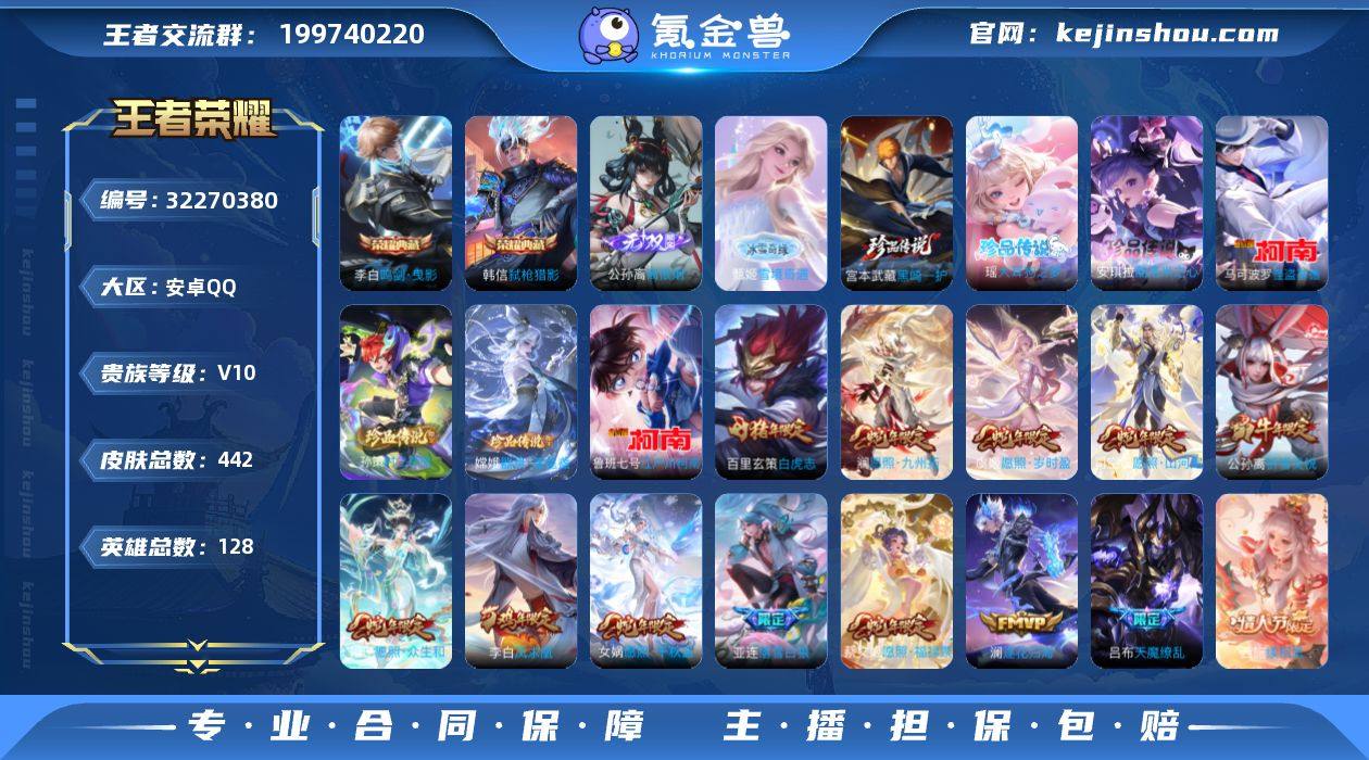 V10 3典藏 2无双 7珍品 48传说 442皮肤 128英雄 【3水晶】李白-鸣剑·曳影,韩信-弑枪猎影【2无双】公孙离-离恨烟,甄姬-雪境奇遇【7珍品传说】马可波罗-怪盗基德,鲁班七号-江户川柯南,孙策-时之奇旅,嫦娥-器灵·落星盏,安琪拉-酷洛米之心,瑶-大耳狗之梦,宫本武藏-黑崎一护【48传说】马超-无双飞将,百里玄策-白虎志,达摩-黄金狮子座,狄仁杰-超时空战士,貂蝉-猫影幻舞,干将莫邪-久胜战神,公孙离-祈雪灵祝,宫本武藏-地狱之眼,镜-炽阳神光,铠-绛天战甲,李白-凤求凰,李信-一念神魔,刘备-时之恋人,吕布-天魔缭乱,梦奇-胖达荣荣,孙策-末日机甲,孙尚香-末日机甲,孙尚香-异界灵契,孙悟空-地狱火,孙悟空-零号·赤焰,虞姬-云霓雀翎,虞姬-启明星使,张良-黄金白羊座,诸葛亮-武陵仙君,马可波罗-妄想实况,东皇太一-灼幽烈阳,花木兰-燃星之曲,夏洛特-浮生妄,王昭君-星穹之声,典韦-战鼓燎原,亚连-落雪白狼,大乔-时之奇旅,露娜-霜月吟,艾琳-觅芳踪,澜-逐花归海,曜-云鹰飞将,桑启-鸣野蒿,云缨-幻光神枪,裴擒虎-祥瑞亨通,妲己-愿照·众生和,司空震-愿照·山河定,蔡文姬-愿照·福禄聚,虞姬-愿照·岁时盈,澜-愿照·九州拓,女娲-愿照·千秋盛,西施-续相思,后羿-千劫归真【108史诗】元歌-无心,鬼谷子-五谷丰年,赵...