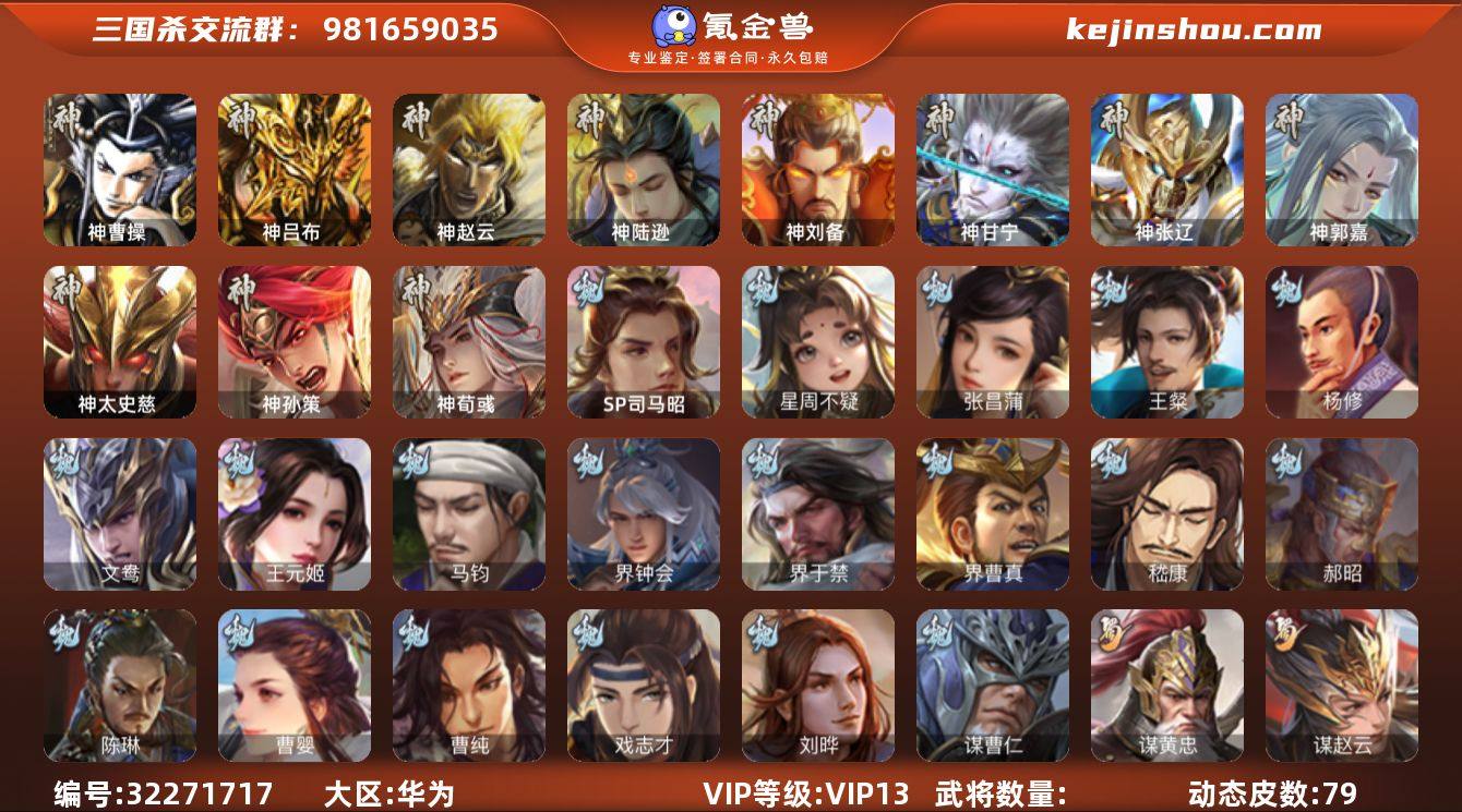 [17540002]标题:QD0004 官阶: 大将军 VIP等级: VIP13 动态皮肤数量: 79 史诗武将数量:82 宝珠数量:7 将魂数量:5479 雁翎数量:21757 心愿积分数量:11353 神将: 神曹操,神甘宁,神郭嘉,神刘备,神陆逊,神吕布,神孙策,神太史慈,神荀彧,神张辽,神赵云 魏国武将: 刘晔,戏志才,曹纯,曹婴,陈琳,程昱,郝昭,嵇康,界曹真,界于禁,界钟会,马钧,王元姬,文鸯,杨修,王粲,张昌蒲,谋曹仁,星周不疑,SP司马昭 蜀国武将: 董允,关索,花鬘,界黄忠,谯周,沙摩柯,王平,张星彩,赵襄,周群,诸葛瞻,谋马超,谋赵云,谋黄忠,马云騄 吴国武将: 贺齐,界步练师,界徐盛,界朱然,留赞,骆统,孙寒华,孙皓,吴景,周处,文鸯,谋黄盖,势太史慈 群国武将: 卑弥呼,杜预,公孙康,界李儒,界左慈,沮授,刘焉,刘璋,祢衡,南华老仙,麹义,士燮,苏飞,陶谦,王允,兀突骨,星甘宁,星黄忠,许攸,杨彪,张让,左慈,裴秀,谋貂蝉