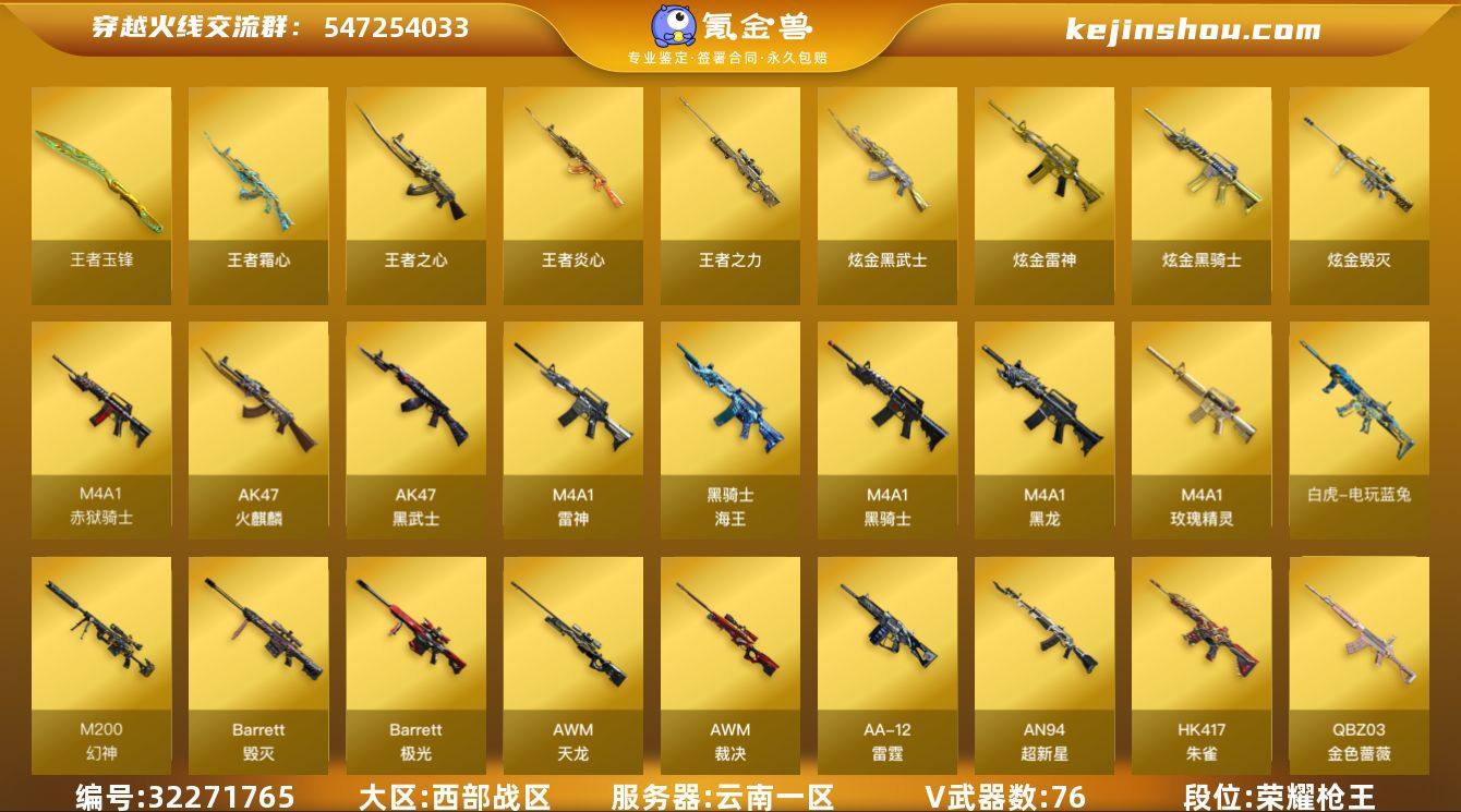 【穿越火线CF-2970】云南一区-84V-19王者-4炫金 【传说角色】:传说女帝 【热门武器】:QBZ03-金色蔷薇,M14EBR-玄武,Scar Light-白虎,HK417-朱雀,M200-幻神,死亡之眼,荣耀世冠-雷神,白虎-电玩蓝兔,柯尔特-冠军之特,王者炎心,M4A1-黑骑士,汤姆逊-烈龙*6,RPK-盘龙*6,加特林-炼狱*2,沙鹰-修罗*4,Knife-冠军之刃,金刚伞 【王者炫金武器】:炫金骑士,炫金毁灭,炫金雷神,炫金武士,王者炎心,王者之力,王者之心,王者霜心,王者玉锋 【音效卡】:M200-幻神音效卡,M4A1-雷神音效卡,M4A1-黑龙音效卡,M4A1-黑骑士音效卡,Barrett-毁灭音效卡,Barrett-极光音效卡,Scar Light-白虎音效卡,白鲨语音包 【稀有皮肤】:幻神-巅峰荣耀,幻神-动感闪耀 皮肤,QBZ03-冠军之薇,雷神-耀金皮肤,雷神-宠儿-2019MVP,雷神-杨戬,火麒麟-AG战队皮肤,火麒麟-平天大圣,火麒麟-百城,火麒麟-心动糖果,黑骑士-暗月,黑骑士-冠军之势,毁灭-暗月,毁灭-荣耀之怒,毁灭-星空,天龙-能量核心,AWM-天龙-传奇70KG,无影耀金皮肤,屠龙-春桃 皮肤 【角色】:传说女帝,王者-零,王者沙漠玫瑰,灵狐者-职业经理,零,葵,樱,炫,雨棠,鹰,战地猎狐,蜀雪,铁骑荣耀,灵动武士,...