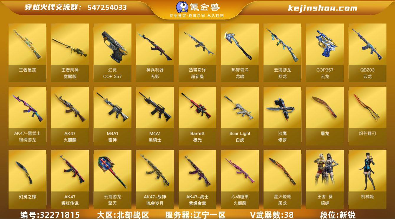 辽宁一区-39V-2王者-0炫金 【热门武器】:Scar Light-白虎,M4A1-青龙,Cat-刀锋,M4A1-黑骑士,COP 357-幻灵*2,沙鹰-修罗*2,炽芒蝶刃 【王者炫金武器】:王者星霆 【音效卡】:Scar Light-白虎音效卡,QBZ03-天罚音效卡 【皮肤】:火麒麟-心动糖果,战神-紫绶金章皮肤*3,战神-流金岁月皮肤,屠龙-星火燎原 【角色】:机械姬,王者-葵-貂蝉,奇洋探员,云海玲珑,飞虎队-X,嘉年华灵狐,灵狐者-X,潘多拉-X,斯沃特-X,蜀雪,新娜塔莎 【人偶武器】:白虎-迷你小艾,AWM-灵狐-15周年嘉年华,Cat-刀锋,迷你牛魔王,生化手雷-机甲核心 【暴走生化】:超级对讲机 【挑战大师】:激光毁灭者III-白马银枪,机甲撕裂者III,试炼破坏者III,神圣爆裂者-末日III 【英雄级武器】:AK47-火麒麟,M4A1-雷神,M4A1-黑骑士,M4A1-青龙,Scar Light-白虎,QBZ03-天罚,无影-神兵利器,QBZ03-云龙,黑武士-锦绣游龙,超新星-热带奇洋,AK-47-猩红传说*4,Barrett-极光,王者风神-觉醒版,烈龙-云海游龙,沙鹰-修罗*2,COP 357-幻灵*2,COP 357-云龙,屠龙*2,幻灵之锋,炽芒蝶刃,擎天-云海游龙,龙啸-热带奇洋,高爆手雷-幻灵*2,高爆手雷-云龙,手雷-云海游龙,手雷-热带奇洋,闪光弹-...