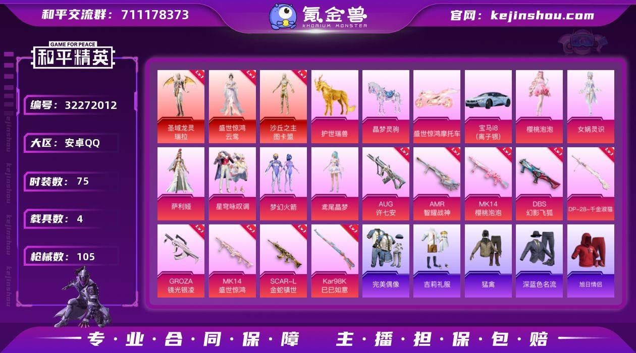 【3红装3级图卡盟龙妈云鸾 6粉装9特效枪4载具 可秒换绑不用等】 安卓Q区-44281热力值-75套装-105枪皮 【3红装】 圣域龙灵-瑞拉(1级) 盛世惊鸿-云鸾(1级) 沙丘之主-图卡盟(3级)【4载具】 宝马i8(离子银) 盛世惊鸿摩托车 晶梦灵驹 护世瑞兽【6粉装】 梦幻火箭 角色-樱桃泡泡 星穹咏叹调 角色-鸢尾晶梦 角色-萨利娅 角色-女娲灵识【9特效枪】 Mk14-樱桃泡泡(2级) DBS-幻影飞狐(4级) AMR-智耀战神(4级) GROZA-镜光银凌(5级) AUG-许七安(5级) DP-28-千金淑猫(3级) Kar98K-巳巳如意(5级) Mk14-盛世惊鸿(3级) SCAR-L-金蛇镇世(3级)【5热门】 长空猛禽 SS24特训 SS23特训 Mini14-梦幻火箭 MG3-幻世战舞者【8飞行器】 彩虹独角兽飞行器 龙翔九天飞行器 圣域金龙飞行器 雀灵庇佑飞行器 酣梦熊熊飞行器 祥瑞起舞飞行器 凤舞九天飞行器 万象金身飞行器 营地ID:980049790