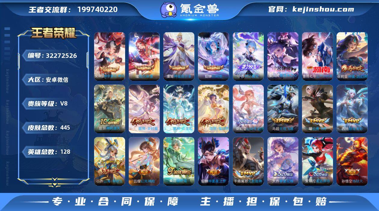安卓WX-V8-最强王者段位-128英雄-445皮肤-4典藏皮肤-1无双-2珍品传说-20传说-132史诗 【英雄全皮】:刘禅全皮,孙权全皮,朵莉亚全皮,鬼谷子全皮,敖隐全皮,蒙犽全皮,蒙恬全皮,阿古朵全皮,戈娅全皮,空空儿全皮,影全皮,海诺全皮,少司缘全皮 【荣耀典藏】:貂蝉幻阙歌,虞姬神鉴启示录,瑶拾光映像,安琪拉颠倒童话魔镜 【无双皮肤】:小乔时之魔女 【珍品传说】:安琪拉酷洛米之心,鲁班七号江户川柯南 【传说皮肤】:朵莉亚神骥鸣幻洲,后羿神树通天,妲己愿照众生和,蔡文姬愿照福禄聚,虞姬愿照岁时盈,云缨幻光神枪,桑启鸣野蒿,朵莉亚心动手记,安琪拉追逃游戏,小乔山海琳琅生,马超无双飞将,大乔挚爱花嫁,西施游龙清影,李元芳飞鸢探春,虞姬启明星使,曜云鹰飞将,张良黄金白羊座,干将莫邪久胜战神,貂蝉仲夏夜之梦,孙悟空地狱火 【限定皮肤】:蒙犽顽岩魄,蔡文姬夏日便利店,大乔绒语心约,虞姬夏日便利店,姜子牙天穹之誓,杨戬破阵退雄兵,狄仁杰阴阳师,小乔山海琳琅生,赵云皇家上将,墨子神迹守卫,妲己时之奇旅,孙尚香蔷薇恋人,庄周高山流水,高渐离死亡摇滚,高渐离玩趣恶龙,钟无艳超时空战士,扁鹊奇幻香踪,白起夜都怪侠,芈月重明,芈月...