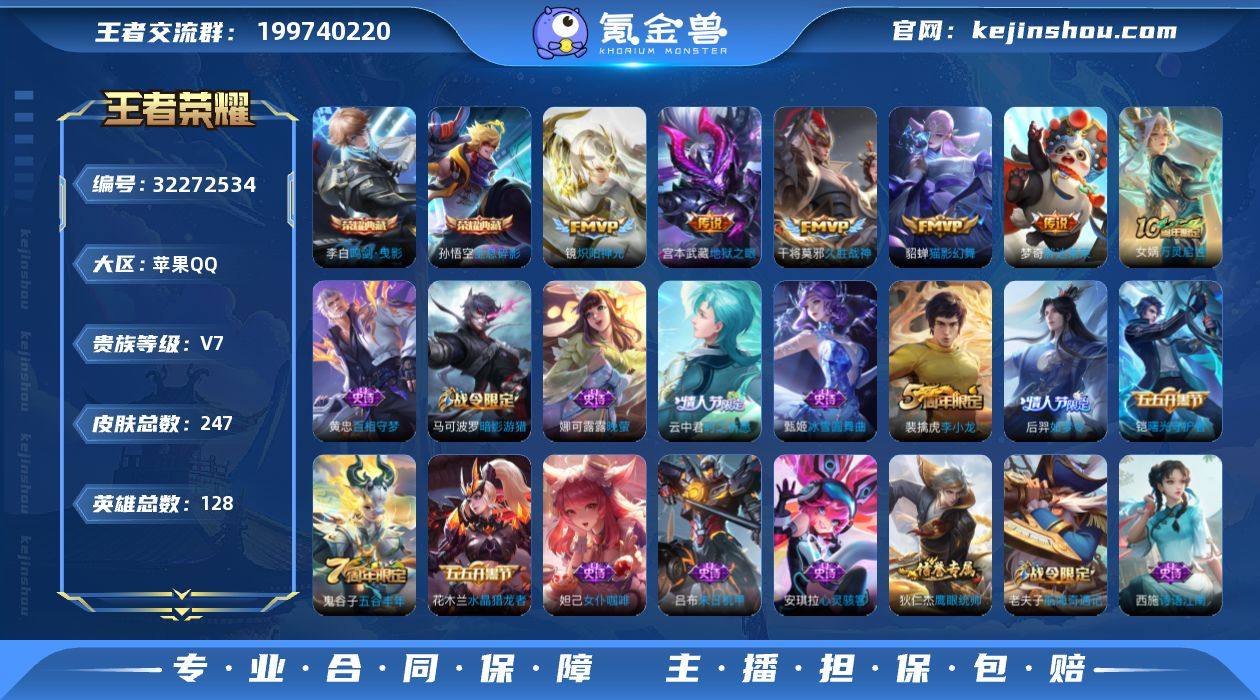 实名: 可修改 性别: 男号 贵族等级: V7 英雄数: 128 皮肤数: 247 荣耀水晶: 鸣剑·曳影,全息碎影 传说皮: 猫影幻舞,久胜战神,炽阳神光,地狱之眼,胖达荣荣 限定皮: 遇见飞天,李小龙,梁祝,如梦令-后羿,高山流水,时之祈愿-云中君,五谷丰年 亮点: 【优质装备】:鸣剑·曳影,全息碎影(猴子典藏),猫影幻舞,久胜战神,炽阳神光,地狱之眼,胖达荣荣