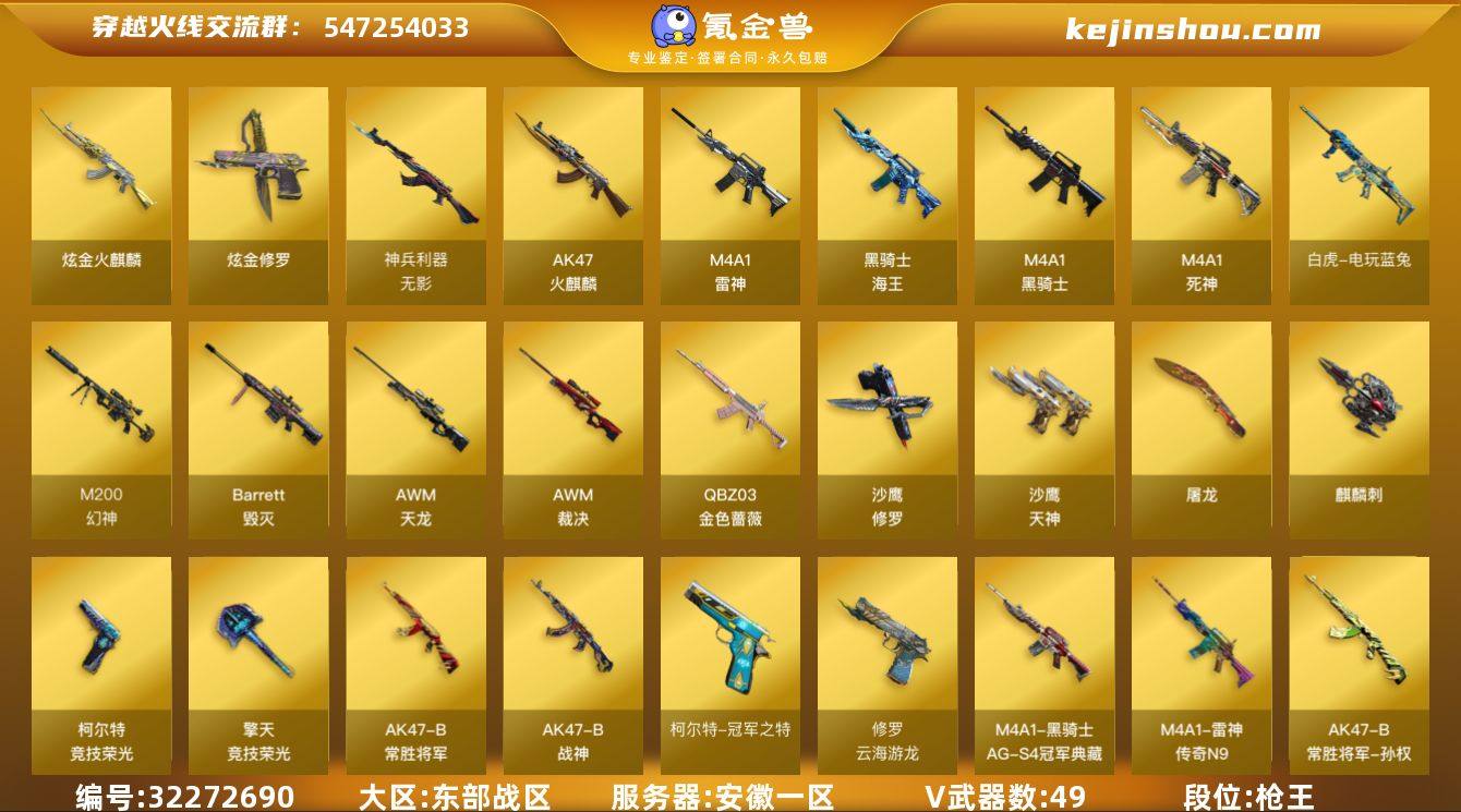 安徽一区-50V-3王者-2炫金 【热门武器】:QBZ03-金色蔷薇,M200-幻神,白虎-电玩蓝兔,柯尔特-冠军之特,M4A1-黑骑士,USP-雷暴,沙鹰-修罗 【王者炫金武器】:炫金火麒麟,炫金修罗 【音效卡】:M4A1-雷神-云海游龙音效卡,M4A1-黑骑士音效卡 【皮肤】:幻神-CFS2022,M200-幻神-N9-2022MVP,幻神-动感闪耀 皮肤,幻神-电流骇客 皮肤,幻神-电竞之星 皮肤,ScarLight-白虎-冠军之虎皮肤,雷神-传奇N9,火麒麟-雷神,火麒麟-华夏之心,火麒麟-心动糖果,毁灭-英雄计划 皮肤,黑骑士-AG-S4冠军典藏,战神-粉色甜心皮肤*2,战神-紫绶金章皮肤*2,战神-流金岁月皮肤,AK47-B-常胜将军-孙权*3,屠龙-荣耀之锋*3,屠龙-荣耀世冠AG,屠龙-春桃 皮肤 【角色】:王者-葵-貂蝉,王者玲珑-小乔,堕落女神,云海玲珑,暗夜-X,初恋灵狐,风暴女,嘉年华灵狐,潘多拉-X,潘多拉-甜心教官,斯沃特-X,蜀雪,兔囡囡,影武者-X 【人偶武器】:天龙-曼陀罗,AWM-灵狐-15周年嘉年华,生化手雷-机甲核心,闪光弹-小乔,闪光弹-貂蝉,高爆手雷-大乔,迷你超能女侍,灵狐娃娃手雷 【暴走生化】:超级对讲机 【挑战大师】:AK47-冰龙粉碎者,激光毁灭者III-白马银枪,激光毁灭者III,阐释者III 【英...