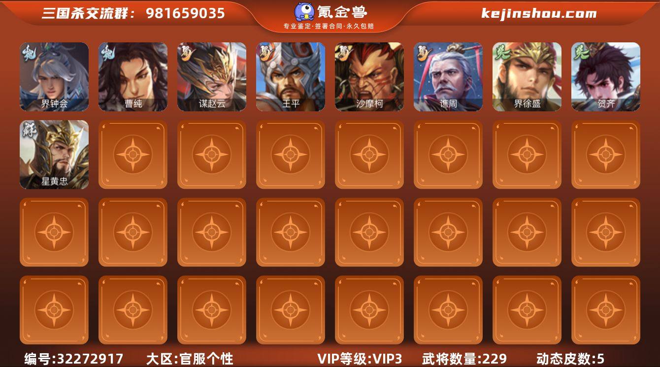 【1720】官阶:领军将军;VIP等级:VIP3;史诗武将数量:10;动态皮肤数量:5;武将总数:229;史诗宝珠数量:29;将魂数量:4041;神将:1;魏国史诗武将:4;蜀国史诗武将:4;吴国史诗武将:2;群史诗武将:1 神吕蒙,界钟会,曹纯,谋赵云,王平,沙摩柯,谯周,界徐盛,贺齐,星黄忠,神吕蒙-心生万象,神赵云-神龙天降,张昌蒲-龙年端午(动态),钟会-龙年端午(动态),费祎-安民护祚(动态),卧龙诸葛-火烧博望(动态),徐盛-破军杀将(动态),孙寒华-蛇年限定(动态),吕布-鼠年七夕(动态),界吕布-鼠年七夕(动态)