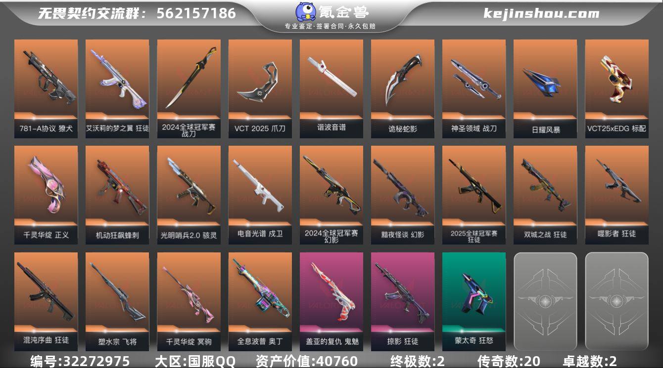 段位: 黄金 亮点皮肤: 幻影-2024全球冠军赛,战刀-2024全球冠军赛 套装: 2024全球冠军赛套装,VCTCN2025套装,VCT 2025赛季礼包 近战武器皮肤: 神圣领域 战刀,VCT 2025 爪刀,诡秘蛇影,谐波音谱-电音光谱,日耀风暴 步枪皮肤: 獠犬-781-A协议,狂徒-艾沃莉的梦之翼,狂徒-混沌序曲,幻影-黯夜怪谈,狂徒-掠影,狂徒-双城之战,狂徒-噬影者,戍卫-电音光谱,2025全球冠军赛 狂徒 佩枪皮肤: 鬼魅-盖亚的复仇,正义-千灵华绽,标配-VCT25xEDG,蒙太奇 狂怒 狙击枪皮肤: 飞将-塑水宗,冥驹-千灵华绽 冲锋枪皮肤: 骇灵-光明哨兵2.0,蜂刺-机动狂飙 机枪皮肤: 奥丁-全息波普 亮点: 【优质装备】:2024全球冠军赛套装,冥驹-千灵华绽,狂徒-艾沃莉的梦之翼,幻影-2024全球冠军赛,狂徒-混沌序曲,狂徒-掠影,獠犬-781-A协议,正义-千灵华绽,幻影-黯夜怪谈,鬼魅-盖亚的复仇,骇灵-光明哨兵2.0,奥丁-全息波普,飞将-塑水宗,战刀-2024全球冠军赛,神圣领域 战刀,VCT 2025 爪刀,诡秘蛇影,谐波音谱,日耀风暴 遗器,2025全球冠军赛 狂徒