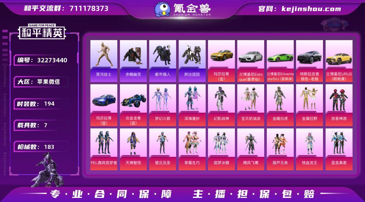 【特价出售】苹果 微信-24粉装-10特效枪-7载具-4粉色飞行器-91769热力值-6王牌印记-194套装-183枪皮 【热门品类】:粉装-梦幻火箭,套装-赤蝎幽灵,套装-都市猎人,套装-冥河战士,套装-小丑鱼,套装-胖达团团,套装-金羽特工,套装-忍者信条,套装-SS1特训,熔岩游骑兵连帽夹克 【粉色套装】:粉装-深海曼妙,粉装-幻影战神,粉装-宝贝奶油派,粉装-金曜白虎,粉装-梦幻火箭,粉装-金属狂野,粉装-放客神游,粉装-PEL轰鸣竞梦者,粉装-天禅智恒,粉装-彗云及圣,粉装-草莓生巧,粉装-甜梦冰蝶,粉装-飓风飞鹰,粉装-葫芦兄弟,粉装-铁血龙王,粉装-显圣真君,粉装-桀骜红莲,粉装-银龙傲海,粉装-骨龙祭渊,粉装-暗夜玫瑰,角色-闪耀迪迦,角色-赛罗闪耀型,粉装-山涧鹿灵,角色-洛天依 【粉色枪皮等级】:AKM-炫紫旋律(五级),AKM-梦之光华(五级),M16A4-葫芦兄弟(一级),SCAR-L-机甲封神(三级),M416-五爪金龙(六级),M416-心之恋语(三级),M416-风花雪月(三级),M762-甜蜜誓约(二级),SLR-暗夜玫瑰(一级),MG3-洛神天依(二级) 【粉色载具】:特斯拉Model X(冷光银),兰博基尼Aventador SVJ(翡翠绿),兰博基尼Estoque(尊享铂),兰博基尼URUS(明艳黄),玛莎拉蒂Ghib...