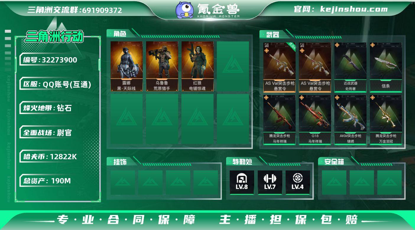 【SJZD2894】总资产(M):190M/哈夫币(K):12822K/哈夫币(K):12822K/传说枪皮数:38/全面战场等级:50_段位:尉官/烽火地带等级:60_段位:钻石/露娜-黑·天际线/红狼-电锯惊魂/乌鲁鲁-荒原猎手/近战-信条/近战-处刑者/近战-黑鹰/AS Val突击步枪-悬赏令/优品B典藏武器外观-AS Val突击步枪-悬赏令/M4A1突击步枪-阿米娅/AKM突击步枪-锦绣/ASh-12战斗步枪-鹅鸭杀/AUG突击步枪-悠然茶歇/AK-12突击步枪-特斯拉线圈/SCAR-H战斗步枪-启航/G3战斗步枪-骑士/CAR-15突击步枪-阿米娅/腾龙突击步枪-捞点薯条/腾龙突击步枪-马年祥瑞/腾龙突击步枪-万金泪冠/K437突击步枪-几何解构/K437突击步枪-锦绣/KC17突击步枪-电锯惊魂/MK47突击步枪-悠然茶歇/MK47突击步枪-暗星/P90冲锋枪-信条/UZI冲锋枪-特斯拉线圈/UZI冲锋枪-悠然茶歇/SMG-45冲锋枪-锦绣/SR-3M紧凑突击步枪-特斯拉线圈/勇士冲锋枪-能天使-午夜邮差/勇士冲锋枪-万金泪冠/QCQ171冲锋枪-鹅鸭杀/M250通用机枪-几何解构/QJB201轻机枪-鹅鸭杀/M14射手步枪-蛮荒/M14射手步枪-缄花/SR-25射手步枪-信条/SR-25射手步枪-缄花/SR-9射手步枪-几何解构/AWM狙击步枪-捞点薯条/AWM狙击步枪-万金泪冠/.357左轮-缄花/G18-马年祥瑞/93R-捞点薯条/复合弓-...