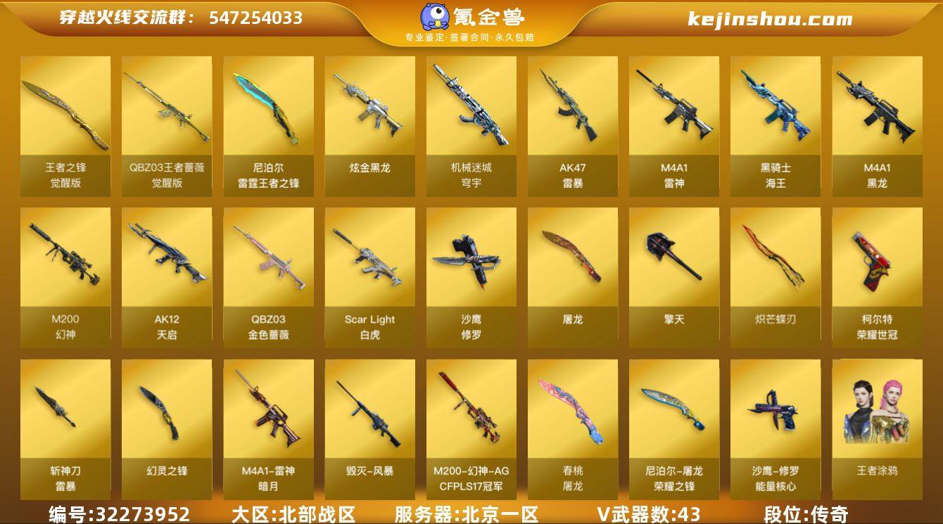 北京一区-46V-9王者武器数-1炫金武器数 【热门武器】:QBZ03-金色蔷薇,Scar Light-白虎,M200-幻神,死亡之眼,荣耀世冠-柯尔特,斯泰尔-蝴蝶,USP-雷暴,沙鹰-修罗*2,炽芒蝶刃,黄金猫猫手套-白鲨 【王者炫金武器】:雷霆王者之锋,炫金黑龙 【音效卡】:QBZ03-金色蔷薇音效卡,70KG语音包 【皮肤】:幻神-周瑜皮肤,幻神-AG-CFPLS17冠军,雷神-暗月,雷神-荣耀之魄,毁灭-风暴,修罗-能量核心,屠龙-荣耀之锋,屠龙-春桃 皮肤,龙啸-蛇姬 皮肤 【角色】:王者涂鸦,修道士,暗夜-X,初恋灵狐,风暴女,灵狐者-X,灵狐者-七夕宝贝,龙儿-小淘气,麻雀,曼陀罗-X,潘多拉-X,潘多拉-甜心教官,青霞仙子,新娜塔莎,雪莉杨,雪莉杨-摸金校尉,职业选手 【人偶武器】:斯泰尔-蝴蝶,黄金迷你深渊冰龙 【暴走生化】:死亡之眼,超级对讲机 【英雄级武器】:M4A1-黑龙,M4A1-雷神,AK12-天启,AK47-雷暴*2,Scar Light-白虎,QBZ03-金色蔷薇,黑骑士-海王,QBZ-03-王者蔷薇-觉醒版,机械迷城-穹宇,M200-幻神,沙鹰-修罗*2,USP-雷暴,荣耀世冠-柯尔特,屠龙,擎天,幻灵之锋,炽芒蝶刃,斩神刀-雷暴,王者之锋-觉醒版,高爆手雷-雷暴*5,高爆手雷-幻灵*4,高爆手雷-雷霆王者-觉...