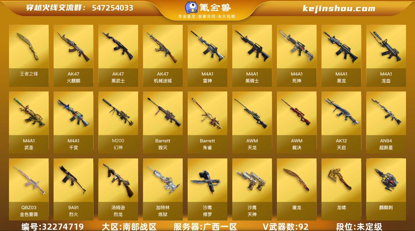 北方大区-96V-7王者武器数-2炫金武器数 【热门武器】:QBZ03-金色蔷薇,HK417-朱雀,M200-幻神,死亡之眼,金色小号,Cat-刀锋,牛牛-AK47,M4A1-黑骑士,汤姆逊-烈龙*6,RPK-盘龙*6,降世魔童,沙鹰-修罗*4,金刚伞 【王者炫金武器】:王者之势,王者之武,王者之心,炫金骑士,炫金修罗 【音效卡】:M200-幻神音效卡,AK47-火麒麟音效卡,M4A1-雷神音效卡,M4A1-黑龙音效卡,M4A1-黑骑士音效卡,Barrett-毁灭音效卡,QBZ03-金色蔷薇音效卡,绝迹语音包,Barrett-碧霄极光音效卡*3 【皮肤】:幻神-CFS2022,烈龙-星空,雷神-暗月,雷神-能量核心,雷神-荣耀之魄,雷神-星空,雷神-虎将*2,雷神-耀金皮肤,雷神-冠军之魄,雷神-宠儿-2019MVP,火麒麟-华夏之心,火麒麟-轻羽皮肤,火麒麟-巅峰荣耀,火麒麟-心动糖果,毁灭-荣耀之怒,毁灭耀金皮肤,毁灭-星空,黑龙-能量核心,黑龙-暗月,M4A1-黑龙-361,黑龙-墨子皮肤,黑骑士-暗月,黑骑士耀金皮肤,无影耀金皮肤*2,AK47-黑武士-361*2,天龙-秘银,AWM-天龙-传奇白鲨,极光-能量核心,屠龙-荣耀之锋,轻型军用手斧-再燃火线 【角色】:樱,零·纪元,战地猎狐,王者-零,王者春,葵-阿尔法武装,暗夜-X,初恋灵狐,风暴女,嘉年华灵狐,兰-新年限定,灵狐者-X,灵狐者-黄金海岸,龙儿,龙儿-小淘气,曼陀罗-X,潘多拉-X,潘多拉-甜心教官,青霞仙子,斯沃特-X,铁骑荣耀,影武者-X,职业选手 【人偶武器】:迷你钢铁终结者,加特林-机械猎手,AWM-灵狐-15周年嘉年华,M37-葵,COP-旗袍,Cat-刀锋,牛牛-AK47,迷你牛魔王,迷你波特博士,夺魂,深渊终结者手雷,灵狐娃娃手雷*2,降世魔童 【暴走生化】:死亡之眼,超级对讲机 【挑战大师】:冰龙粉碎者-白马银枪*2,激光毁灭者III-白马银枪,神圣爆裂者-末日III,阐释者III 【英雄级武器】:M4A1-千变,AK47-火麒...