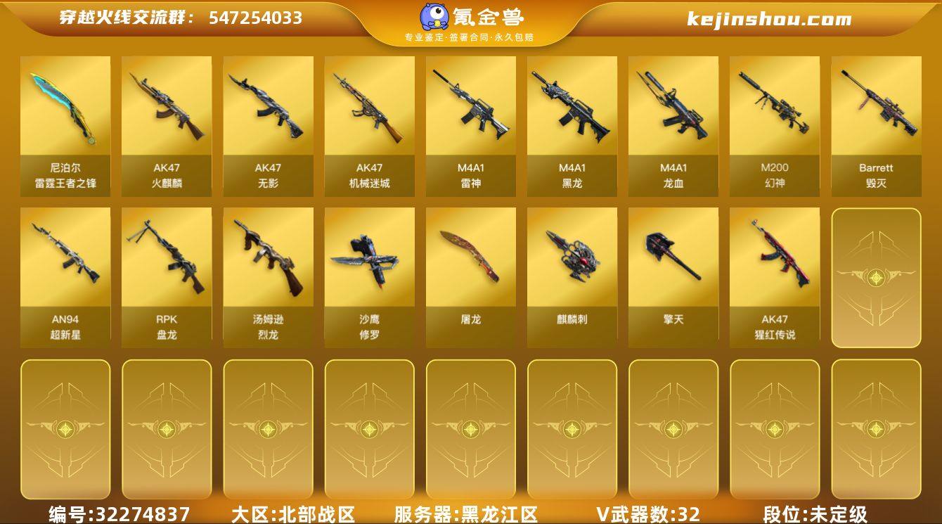 山西一区-36V-1王者武器数-0炫金武器数 【热门武器】:QBZ03-金色蔷薇,M200-幻神,死亡之眼,白虎-电玩蓝兔,牛牛-AK47,汤姆逊-烈龙,沙鹰-修罗,炽芒蝶刃 【音效卡】:屠龙-动感闪耀 音效卡,M200-幻神音效卡,炼狱-百战金芒-庆典舞曲音效卡 【皮肤】:幻神-宠儿-2021MVP,雷神-暗月,雷神-传奇N9,M4A1-再燃火线,火麒麟-轻羽皮肤,火麒麟-平天大圣,火麒麟-心动糖果,毁灭-AG-CFPLS15冠军,毁灭-战神张飞,毁灭-黑大圣皮肤,轻型军用手斧-再燃火线 【角色】:樱,零·纪元,战地猎狐,王者炽天使,乔伊教练,葵-阿尔法武装,暗夜-X,初恋灵狐,电竞少女,飞虎队-X,嘉年华灵狐,卡塔琳娜,兰-空鹰,兰-新年限定,灵狐者-X,灵狐者-职业经理,潘多拉-X,斯沃特-X,铁骑荣耀,维纳斯,幽,游珑儿 【人偶武器】:AWM-灵狐-15周年嘉年华,牛牛-AK47,迷你牛魔王,生化手雷-机甲核心 【暴走生化】:死亡之眼,超级对讲机 【挑战大师】:冰龙粉碎者-白马银枪,激光毁灭者III,神圣爆裂者-末日III*2 【英雄级武器】:AK47-火麒麟*2,M4A1-雷神,无影-神兵利器,黑武士-锦绣游龙,QBZ03-金色蔷薇,烈火-动感闪耀,王者火魄-觉醒版,白虎-电玩蓝兔,机械迷城-穹宇,Barrett-毁灭,Barrett-极光,M200-幻神,炼狱-百战金芒,汤姆逊-烈龙,沙鹰-修罗,柯尔特-百战金芒,天神-动感闪耀,麒麟刺,炽芒蝶刃,屠龙-动感闪耀,麒麟刺-百战金芒,手雷-动感闪耀,闪光弹-幻灵,M4A1-苍鸣雷神,AWM-昌龙,Barrett-碧霄极光 【道具】:BS战队炫彩背包,云山科技背包,全能枪王背包,百战金芒炫彩背包,超级背包,雪域霜狐炫彩背包,哔哩哔哩名片,女皇终结者-魔龙之吻,救世主-黑桃战神,绿色巨人,灵魂忍者,迷雾幽灵,生化弹匣,夺命之镰,防化服*3,金色流光-枪王排位*2,星辰流光-枪王排位,枪王排位28赛季金色流光,枪王排位2...