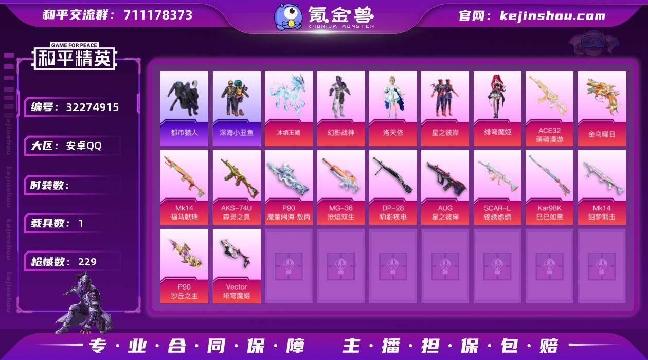 【1载具 13特效枪 4粉装 229枪皮 154套装】8印记/6.9万热力值/68级收藏家/有都市猎人,红眼罩,深海小丑鱼,胖达头盔,粉熊背包/套装-都市猎人,套装-浪漫天命,套装-金耀舞者,套装-暗影哥特,套装-深海小丑鱼,套装-幻影战神,角色-洛天依,套装-星之彼岸,角色-绯穹魔姬/13升级枪:AUG-星之彼岸,ACE32-萌骑漫游,SCAR-L-锦绣绵绵,Kar98K-巳巳如意,Mk14-甜梦熊击,Mk14-福马献瑞,AKS-74U-森灵之息,P90-魔童闹海 敖丙,P90-沙丘之主,Vector-绯穹魔姬,MG-36-沧焰双生,DP-28-豹影疾电,信号枪-金乌曜日/1载具:冰绡玉鳞/13飞行器:马上有福飞行器,梦幻火箭飞行器,鸡智如我飞行器,灵珠游龙飞行器,暮色之舞飞行器,狂鲨锋刃飞行器,幻海精灵飞行器,炫彩糖果飞行器,异域银装飞行器,曦光华影飞行器,飞天猪飞行器,极意拳锋飞行器,智趣喵喵飞行器153327866x,编号:LYMDM91