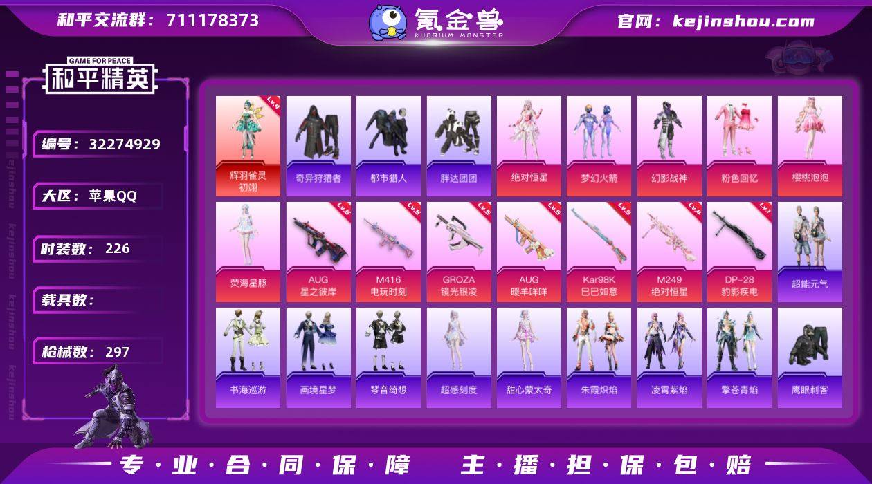 YZJ15652-可二次-苹果Q-1红装5稀有6粉装9特效枪18热门226套装297枪皮 90345热力值 极品红装身法素材号 地铁满天赋 4词条AUG 6级AUG星之彼岸 4级孔雀 新火箭少女 幻影战神 荧海星豚 樱桃泡泡 都市 金羽特工 胖达团团 权威小菠萝 鲨鱼服 奇异狩猎者 天命 蓝甜马卡龙 梦魇先生 满级M4电玩 18印记 历史绝世王牌21星 【1红装】 辉羽雀灵-初翊 (4级) 【5稀有】 奇异狩猎者 AWM-黄金龙骨 AKM-缤纷海域 都市猎人 浪漫天命 【6粉装】 梦幻火箭 荧海星豚 樱桃泡泡 幻影战神 绝对恒星 粉色回忆 【9特效枪】 M416-电玩时刻 (5级) Kar98K-巳巳如意 (5级) DP-28-豹影疾电 (1级) AUG-暖羊咩咩 (5级) GROZA-镜光银凌 (5级) AUG-星之彼岸 (6级) M249-绝对恒星 (4级) Mk14-福马献瑞 (5级) ACE32-萌骑漫游 (2级) 【18热门】 龟仙人 雪山精英 梦魇先生 呆萌铁蟹 鹰眼刺客 迅捷狂鲨 金羽特工 胖达团团 怪笑疯兔 团圆交子 瑞龙福将 漫步者 蓝甜马卡龙 破蛋小黄鸡 极速红龙 弄潮海豚 M762-瑞龙福将 M762-风花雪月 【1飞行器】 梦幻火箭飞行器 【4头盔】 梦幻火箭头盔 深海小丑鱼头盔 金羽特工头盔 马卡龙头盔 【3背包】 梦幻火箭背包 百万伏特背包 深海小丑鱼背包 营地ID:745340766