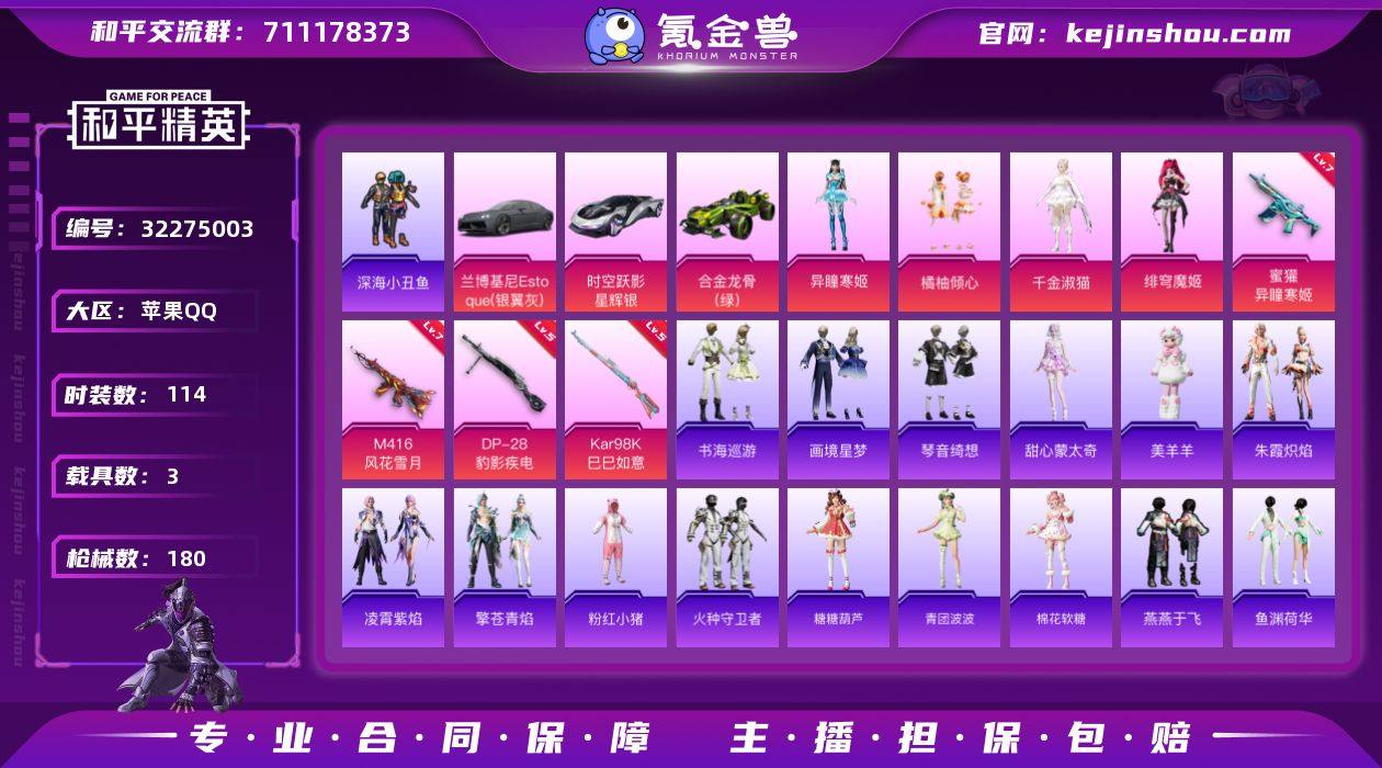 精品号4粉6特3载具 2把满级枪皮 苹果 手Q-4粉装-6特效枪-3载具-6粉色飞行器-59369热力值-12王牌印记-114套装-180枪皮 【热门品类】:套装-深海小丑鱼,套装-粉红小猪 【粉色套装】:粉装-橘柚倾心,角色-千金淑猫,角色-绯穹魔姬,角色-异瞳寒姬 【粉色枪皮等级】:AKM-暮色玫影(三级),M416-风花雪月(七级),蜜獾-异瞳寒姬(七级),Kar98K-巳巳如意(五级),Mk14-福马献瑞(五级),DP-28-豹影疾电(五级) 【粉色载具】:兰博基尼Estoque(银翼灰),时空跃影(星辉银),合金龙骨(绿) 【粉色枪皮】:AKM-暮色玫影,M416-风花雪月,蜜獾-异瞳寒姬,Kar98K-巳巳如意,Mk14-福马献瑞,DP-28-豹影疾电 【粉色飞行器】:炫彩糖果飞行器,梦幻火箭飞行器,庄周梦蝶飞行器,凤舞九天飞行器,万象金身飞行器,极意拳锋飞行器 【粉色降落伞】:绝对恒星降落伞,春暖花开降落伞,筑梦精灵降落伞,第五大道降落伞,仲夏莫吉托降落伞,精灵梦叶罗丽降落伞,千金淑猫降落伞,月影灵韵降落伞,金蛇镇世降落伞,樱桃泡泡降落伞,圣域龙灵降落伞,炫彩糖果降落伞 【稀有套装】:角色-甜心蒙太奇,套装-雪国风尚,套装-炫彩糖果,套装-马上有钱,套装-火种守卫者,套装-糖糖葫芦,套装-青团波波...