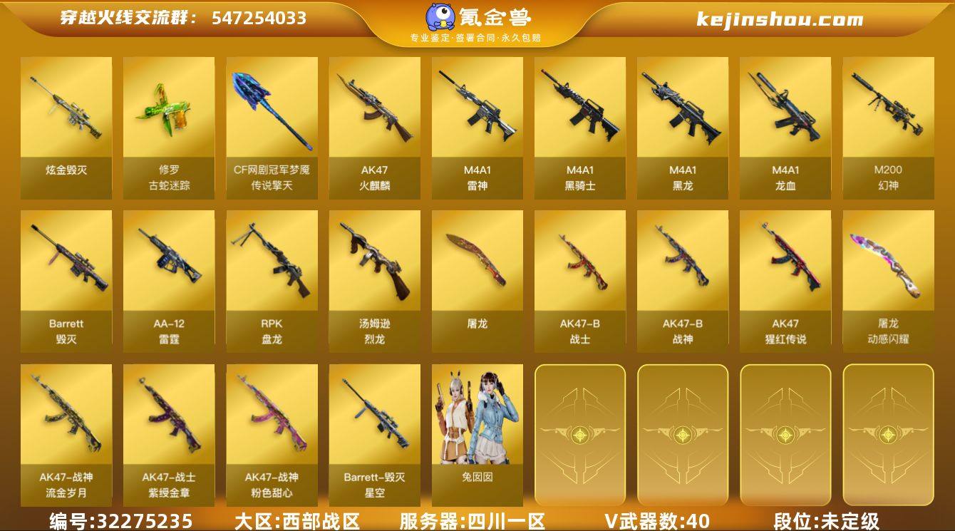 四川一区-45V-0王者武器数-1炫金武器数 【热门武器】:M200-幻神,修罗-古蛇迷踪,死亡之眼,M4A1-黑骑士,汤姆逊-烈龙*5,RPK-盘龙,加特林-炼狱,降世魔童 【王者炫金武器】:炫金毁灭 【音效卡】:Barrett-毁灭音效卡,沙鹰-修罗-盛典舞曲音效卡*2,Barrett-碧霄极光音效卡,炼狱-百战金芒-庆典舞曲音效卡 【皮肤】:幻神-电竞之星 皮肤,雷神-源计划2.0专属 皮肤,M4A1-再燃火线,毁灭-星空,毁灭-百城浙江 皮肤,毁灭-英雄计划 皮肤,黑骑士-破界 皮肤,战神-粉色甜心皮肤*2,战神-紫绶金章皮肤*2,战神-流金岁月皮肤*3,轻型军用手斧-再燃火线 【角色】:零·纪元,蛇隐宗,葵-阿尔法武装,幻面灵狐,空,暗夜-X,葵-赛博朋克,兰-新年限定,曼陀罗-X,潘多拉-甜心教官,蛇姬,兔囡囡 【人偶武器】:迷你钢铁终结者,加特林-机械猎手,AWM-灵狐-15周年嘉年华,迷你深渊冰龙,迷你生化手雷*2,生化手雷-机甲核心,闪光弹-小乔,降世魔童 【暴走生化】:死亡之眼,超级对讲机 【挑战大师】:AK47-冰龙粉碎者,激光毁灭者III-白马银枪,激光毁灭者III,神圣爆裂者-末日III,阐释者III 【英雄级武器】:AK47-火麒麟*2,M4A1-黑龙,M4A1-雷神*2,M4A1-黑骑士,M4A1-龙血,AK-4...
