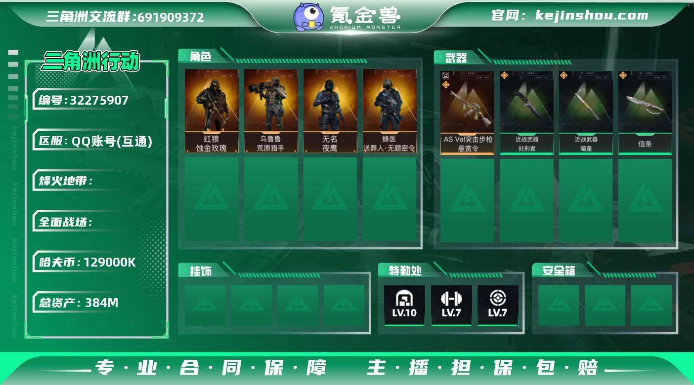 S1455 总资产384M,哈夫币12900w,典藏1 近战4 枪皮数量213,红狼-蚀金玫瑰/乌鲁鲁-荒原猎手/无名-夜鹰/蜂医-送葬人无题密令,近战-暗星/近战-处刑者/近战-信条,AS Val突击步枪-悬赏令(极品C)战场等级13列兵, 行动等级60黑鹰,安全箱等时效性道具请以游戏内数据为准,详情请看图