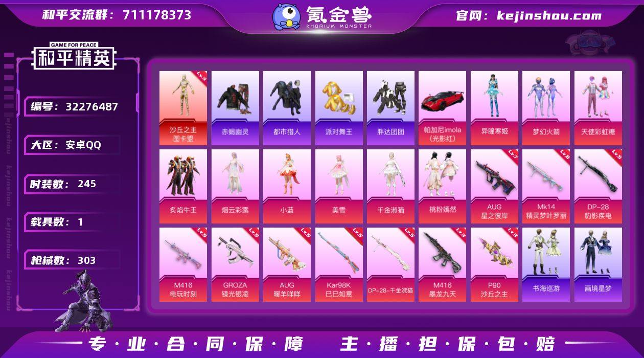 安卓 手Q-1神装-10粉装-13特效枪-1载具-12粉色飞行器-103836热力值-15王牌印记-245套装-303枪皮 【红色神装等级】:沙丘之主-图卡盟(三级) 【红色角色神装】:沙丘之主-图卡盟 【热门品类】:粉装-梦幻火箭,套装-浪漫天命,套装-赤蝎幽灵,套装-都市猎人,套装-派对舞王,套装-小丑鱼,角色-军刀雅典娜,套装-胖达团团,套装-龟仙人,套装-暗影哥特,套装-粉红小猪 【粉色套装】:粉装-天使彩虹糖,粉装-梦幻火箭,粉装-炙焰牛王,角色-烟云彩露,角色-小蓝,角色-美雪,角色-千金淑猫,粉装-桃粉嫣然,角色-异瞳寒姬,角色-罪夜之冕 【粉色枪皮等级】:SCAR-L-灵驹仙姬(二级),M416-电玩时刻(五级),M416-墨龙九天(三级),GROZA-镜光银凌(五级),AUG-星之彼岸(七级),AUG-暖羊咩咩(五级),AKS-74U-森灵之息(五级),P90-沙丘之主(三级),Kar98K-巳巳如意(五级),Mk14-精灵梦叶罗丽(六级),Mk14-福马献瑞(三级),DP-28-千金淑猫(五级),DP-28-豹影疾电(五级) 【粉色载具】:帕加尼imola(光影红) 【粉色枪皮】:SCAR-L-灵驹仙姬,M416-电玩时刻,M416-墨龙九天,GROZA-镜光银凌,AUG-星之彼岸,AUG-暖羊咩咩,AKS-74U-森灵之息,P90-沙丘之主,Kar98K-巳巳如意,Mk14-精灵梦...