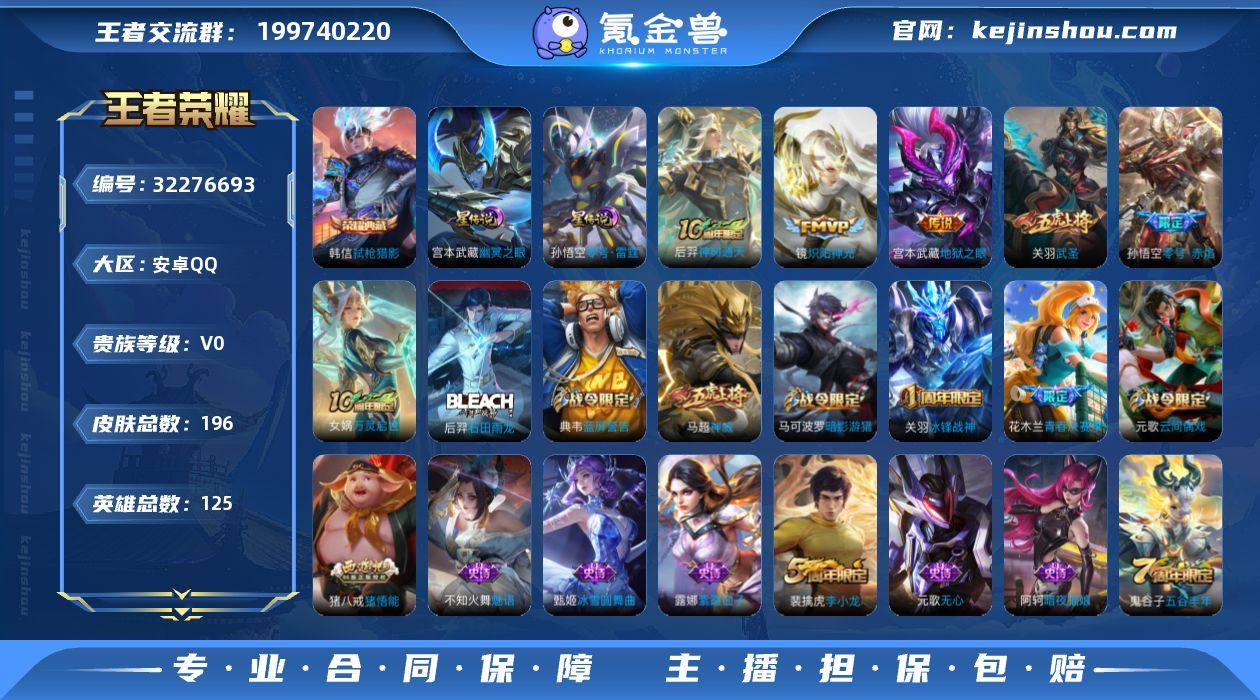 王者荣耀V7 1典藏5传说 200皮肤 成品号可换绑 描述: V7账号,1荣耀典藏,5传说皮肤,总皮肤200个。 账号正常无封禁,可平台验号。 可小刀 诚心出,只走平台,骗子勿扰。