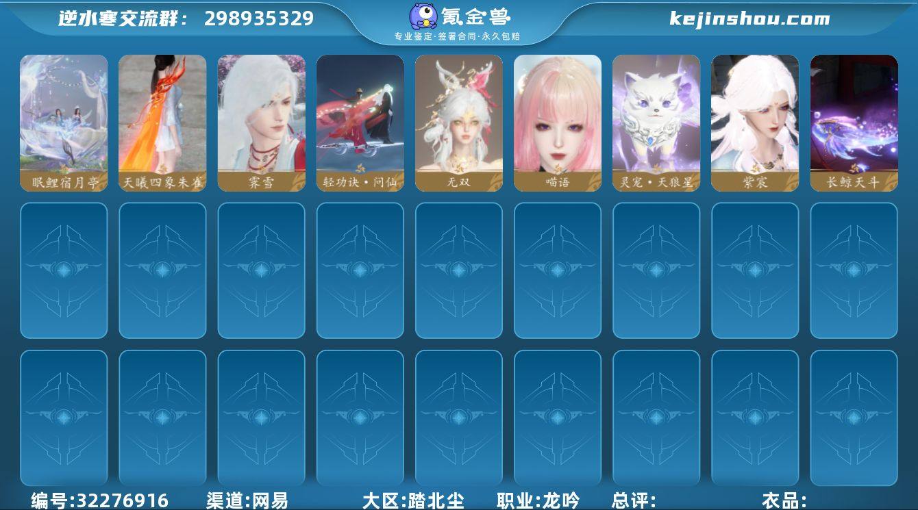 【区服】 紫禁之巅 【战力值】 134.73 【职业】 龙吟 【馆藏】 4级 【衣品值】 167785 【国色值】 36680 【已用天赏石】 14 【天霓染数量】 1 【充值称号】 把酒临风 【累计充值】 24196元 【天霓染】 陆离*1 【灵韵内功】 破霄摧星, 鸣镝裂风, 汲川, 昆吾断玉, 鸣沙诀 【天赏外观】 无双, 喵语, 紫宸, 霁雪, 雷霆武器, 轻功诀问仙, 明河曙天·长鲸天斗, 天曦四象·朱雀 【天赏祥瑞】 眠鲤宿月亭 【祥瑞坐骑】 布丁, 风行·江湖景, 风行·世间情, 风行·万灯明, 云螭·封冰怀雪, 龙衔瑞焰, 金冠鼠鼠, 粉黛娇, 幻琉晶, 狂霸天, 星河转·银昼, 星河转·赤夜, 骋风叱焰, 抟乌镇妖, 贺岁喜狮, 伯力, 咩郎, 瓜皮, 霸霸, 墨流云·玄色, 墨流云·朱红, 墨流云·靛青, 奔虹赤, 帝皇驹, 银砂素波, 绒绒夜, 牛奶酥, 隐云涧, 四方游士, 空山闲, 犬威哮月·沧, 犬威哮月·焰, 玉霄飞练 【商城外观】 甜宙漫游, 夜雪闻梅, 盛浪晴海, 悠影掠风, 金缕漠歌, 紫渊龙堂, 雾都往事, 司玄镇天, 千星咏叹, 跃动心芒, 蝎影度月, 福禄金刚, 晴岸涛吟, 不负卿愿, 帝皇铠甲, 鳞纱幻海, 斗战凌空, 鳞骨逢幽, 星宫遐音, 贪狼摄星, 青林雀舞, 开阳执戈, 紫微御宵, 蓬海沧歌, 衣香鬓影, 混天焚莲, 瀚渊龙炎, 金祷颂晖, 玉...