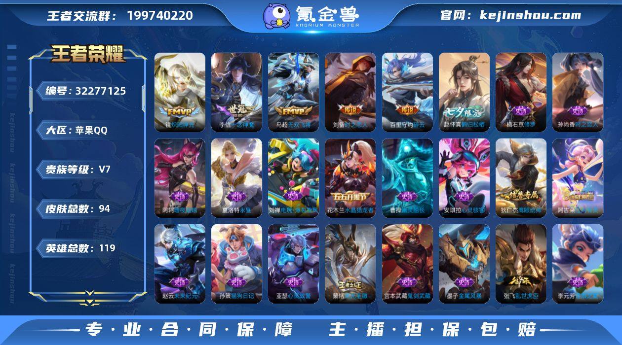-V7-至尊星耀IV段位-119英雄-94皮肤-9传说-1星传说-25史诗 【传说皮肤】:司空震愿照山河定,桑启鸣野蒿,吕布怒海麟威,李白诗剑行,百里守约碎云,马超无双飞将,镜炽阳神光,李信一念神魔,刘备时之恋人 【限定皮肤】:姜子牙天穹之誓,狄仁杰阴阳师,赵云皇家上将,高渐离玩趣恶龙,马可波罗山海玄木吟,狄仁杰魔术师,项羽海滩派对,李元芳云中旅人,沈梦溪大漠名商,裴擒虎李小龙,裴擒虎擒涛扼浪,鲁班大师探海日志,桑启海盐诗旅,赵怀真鹤归松栖,阿古朵江河有灵,张良古海寻踪,蒙恬荣光圣徽,鬼谷子天穹祈灯,刘邦剑破天穹 【年限皮肤】:马可波罗山海玄木吟,司空震愿照山河定 【赛季限定】:沈梦溪大漠名商,李元芳云中旅人,桑启海盐诗旅,裴擒虎擒涛扼浪,鲁班大师探海日志,张良古海寻踪,鬼谷子天穹祈灯,刘邦剑破天穹,姜子牙天穹之誓,东皇太一噬灭天穹,太乙真人谧流熔炉,钟馗虚灵犬护,亚瑟荣光之誓,蒙恬荣光圣徽 【战令限定】:周瑜线条小狗 【史诗皮肤】:周瑜线条小狗,蒙恬荣光圣徽,阿古朵江河有灵,赵怀真鹤归松栖,刘禅电玩爆裂旋风,马可波罗山海玄木吟,夏洛特永昼,裴擒虎李小龙,孙尚香时之恋人,橘右京修罗,狄仁杰鹰眼统帅,孙策猫狗日记...