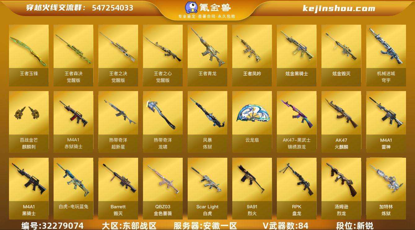 【ky6307】安徽一区-89V-8王者武器数-2炫金武器数 【热门武器】:QBZ03-金色蔷薇,Scar Light-白虎,M200-竞技荣光,死亡之眼*2,荣耀世冠-火麒麟,荣耀世冠-雷神,白虎-电玩蓝兔,荣耀世冠-柯尔特,金色小号,Cat-刀锋,牛牛-AK47,M4A1-黑骑士*2,汤姆逊-烈龙*6,RPK-盘龙*2,加特林-炼狱*3,斯泰尔-蝴蝶,USP-雷暴,沙鹰-修罗*2,炽芒蝶刃,荣耀世冠-龙啸 【王者炫金武器】:王者青龙,王者凤吟,王者玉锋,炫金骑士,炫金毁灭 【音效卡】:M4A1-黑骑士音效卡,Barrett-毁灭音效卡,QBZ03-金色蔷薇音效卡,Scar Light-白虎音效卡,Barrett-碧霄极光音效卡,炼狱-百战金芒-庆典舞曲音效卡 【皮肤】:白虎-电玩粉兔皮肤,雷神-机甲刑天皮肤,雷神-宇航兔皮肤,M4A1-再燃火线,火麒麟-平天大圣,火麒麟-白虎,火麒麟-心动糖果,毁灭-CFS2020,毁灭-黑大圣皮肤*2,毁灭-风暴,毁灭-魔灵皮肤,毁灭-神秘黑洞皮肤,M4A1-千变-孔明皮肤,黑龙-墨子皮肤,黑骑士-暗月,黑骑士-电玩青兔皮肤,战神-粉色甜心皮肤,AWM-天龙-传奇白鲨,加特林-炼狱-钟馗皮肤,屠龙-荣耀世冠AG,轻型军用手斧-再燃火线 【角色】:春,电竞教官-云悠悠,零·纪元,战地猎狐,王者零-华冠丽服,王者樱-热浪...