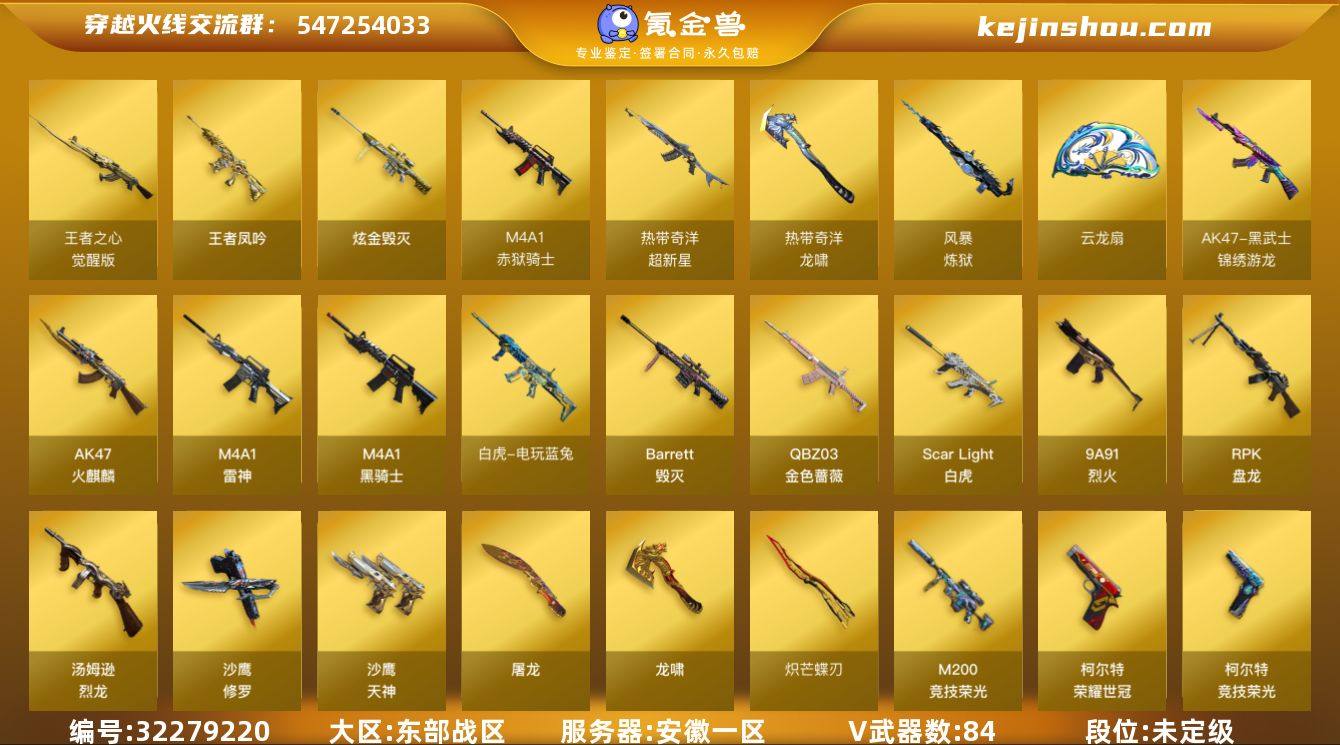 安徽一区-89V-8王者武器数-2炫金武器数 【热门武器】:QBZ03-金色蔷薇,Scar Light-白虎,M200-竞技荣光,死亡之眼*2,荣耀世冠-火麒麟,荣耀世冠-雷神,白虎-电玩蓝兔,荣耀世冠-柯尔特,金色小号,Cat-刀锋,牛牛-AK47,M4A1-黑骑士*2,汤姆逊-烈龙*6,RPK-盘龙*2,加特林-炼狱*3,斯泰尔-蝴蝶,USP-雷暴,沙鹰-修罗*2,炽芒蝶刃,荣耀世冠-龙啸 【王者炫金武器】:王者青龙,王者凤吟,王者玉锋,炫金骑士,炫金毁灭 【音效卡】:M4A1-黑骑士音效卡,Barrett-毁灭音效卡,QBZ03-金色蔷薇音效卡,Scar Light-白虎音效卡,Barrett-碧霄极光音效卡,炼狱-百战金芒-庆典舞曲音效卡 【皮肤】:白虎-电玩粉兔皮肤,雷神-机甲刑天皮肤,雷神-宇航兔皮肤,M4A1-再燃火线,火麒麟-平天大圣,火麒麟-白虎,火麒麟-心动糖果,毁灭-CFS2020,毁灭-黑大圣皮肤*2,毁灭-风暴,毁灭-魔灵皮肤,毁灭-神秘黑洞皮肤,M4A1-千变-孔明皮肤,黑龙-墨子皮肤,黑骑士-暗月,黑骑士-电玩青兔皮肤,战神-粉色甜心皮肤,AWM-天龙-传奇白鲨,加特林-炼狱-钟馗皮肤,屠龙-荣耀世冠AG,轻型军用手斧-再燃火线 【角色】:春,电竞教官-云悠悠,零·纪元,战地猎狐,王者零-华冠丽服,王者樱-热浪之夏,奇洋...