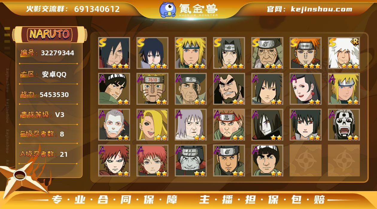 8S忍/21A忍/战力545W/V3/区服3711 【S忍者】 宇智波佐助「漩涡鸣人」,宇智波斑「秽土转生·解」,宇智波佐助「永恒万花筒」,自来也「舞之豪杰」,猿飞日斩「秽土转生」,宇智波鼬「须佐能乎」,佩恩「天道」,波风水门, 【A忍者】 小南「神驹佑将」,机械鸣人「初始形态」,迈特凯「青春爆炸」,土台「忍界大战」,不缘,宇智波泉奈,神农「羁绊」,波风水门「青年」,飞段「恶灵之影」,迪达拉「秽土转生」,千代「近松十人卫」,秋道丁次「忍界大战」,大蛇丸「晓」,宇智波佐助「万花筒写轮眼」,飞段「死司凭血」,我爱罗「疾风传」,蝎,干柿鬼鲛,猿飞阿斯玛,迈特凯, PX_2489791